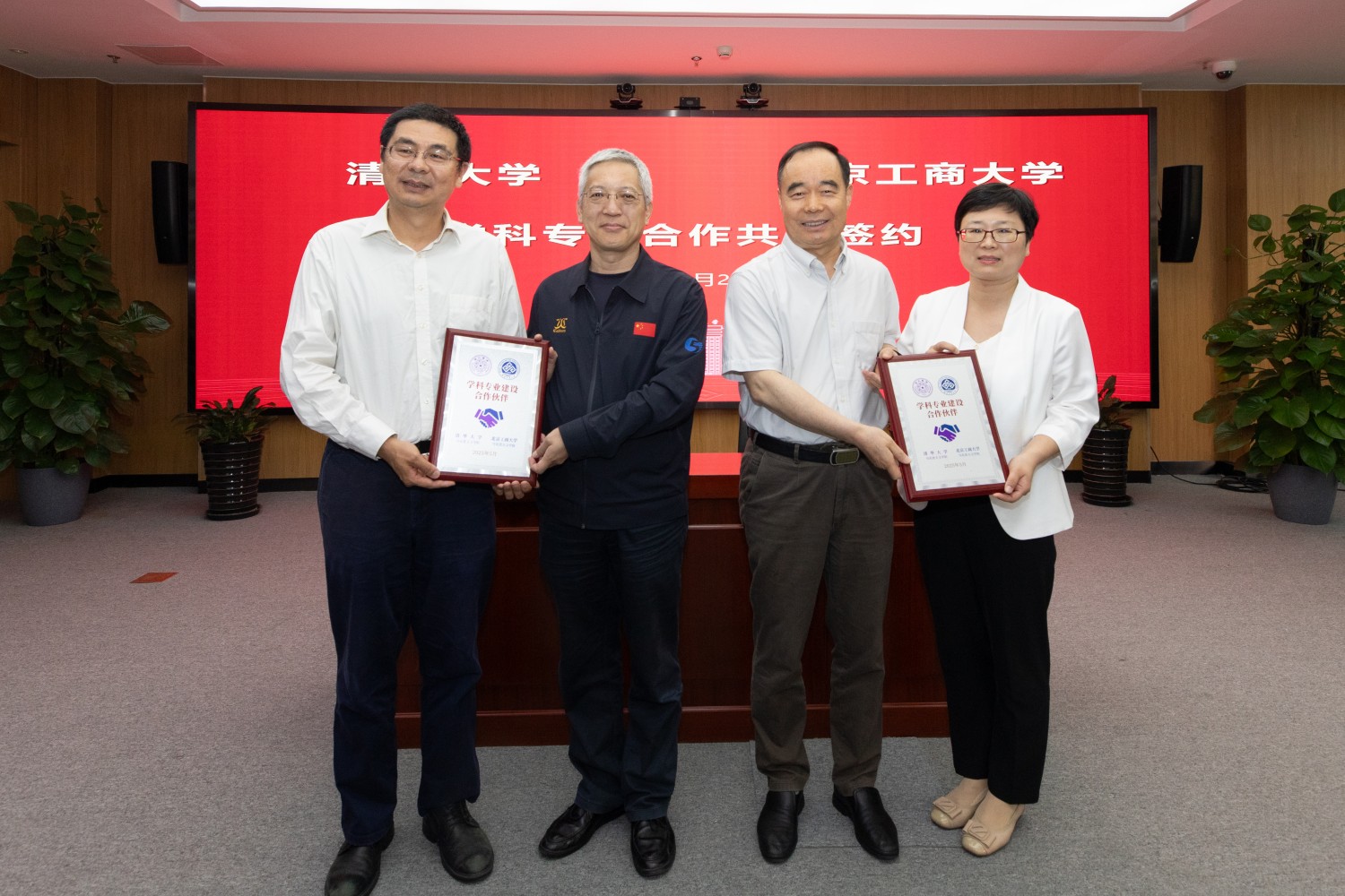 清華大學馬克思主義學院黨委書記何建宇和我校馬克思主義學院院長趙春麗簽約;吉俊民和李中奇為雙方頒發簽約紀念牌。
