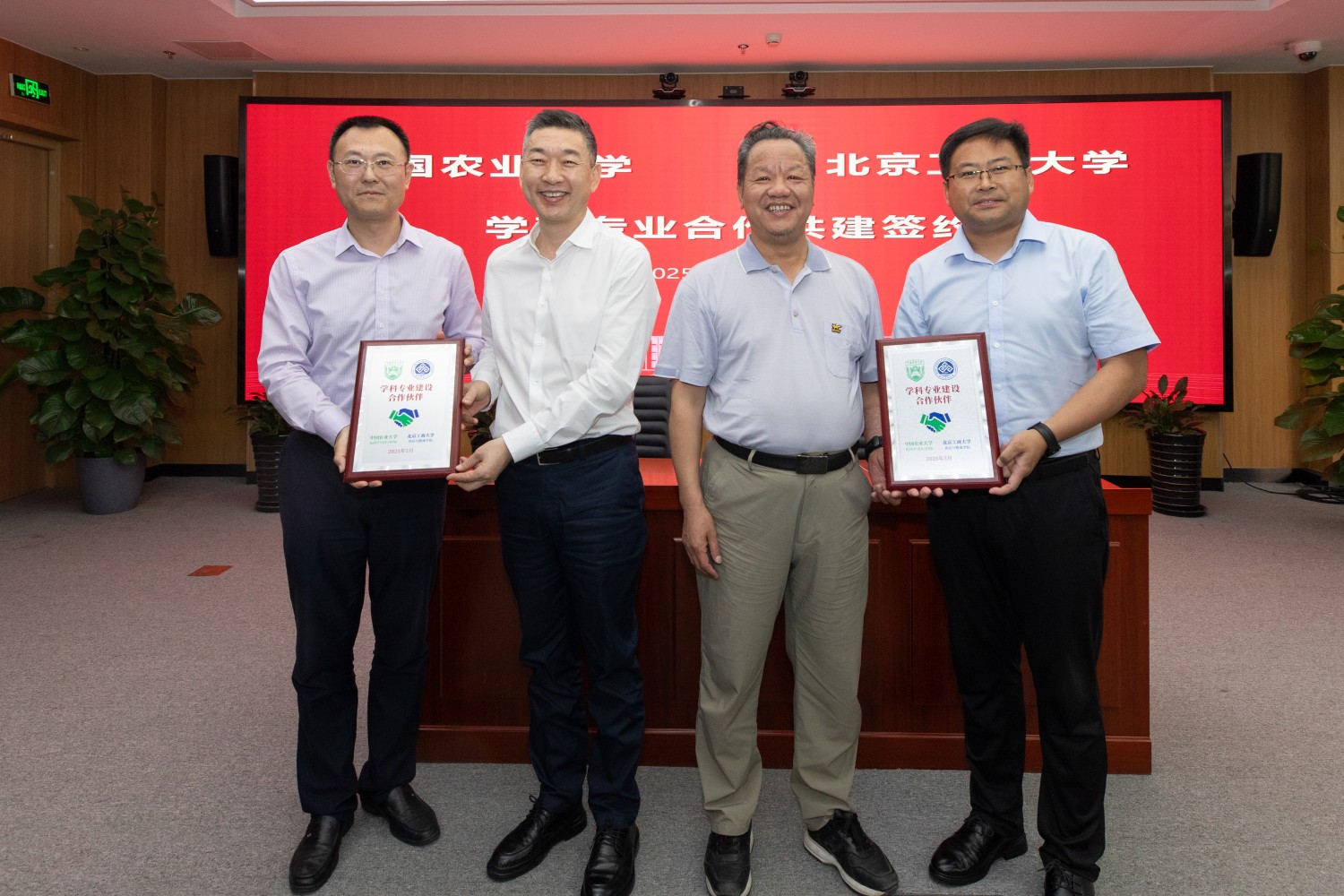 中國農業大學食品科學與營養工程學院黨委書記宋岳鎮和我校食品與健康學院院長王彥波簽約;李培景和鄭文紅為雙方頒發簽約紀念牌。