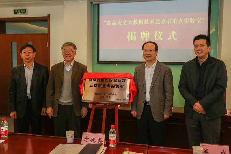 12月18日,我校隆重舉行“食品安全大數據技術”北京市重點實驗室揭牌儀式。北京市科學技術委員會呼文亮書記、鄭煥敏副主任,政策法規與體制改革處楊仁全處長、電子信息與裝備制造處曹崗處長、農村科技發展處張平處長、農村發展中心李守勇副主任、條件財務處李建玲調研員等市科委領導;中國檢驗檢疫科學研究院首席科學家龐國芳院士、北京航空航天大學虛擬現實技術與系統國家重點實驗室副主任吳威教授等多位專家委員出席會議。我校校長孫寶國院士、副校長謝志華教授、副校長方德英教授以及計信學院蔡強院長、院黨委陳誼書記、科技處領導及實驗室教師出席了揭牌儀式。揭牌儀式由副校長謝志華主持。