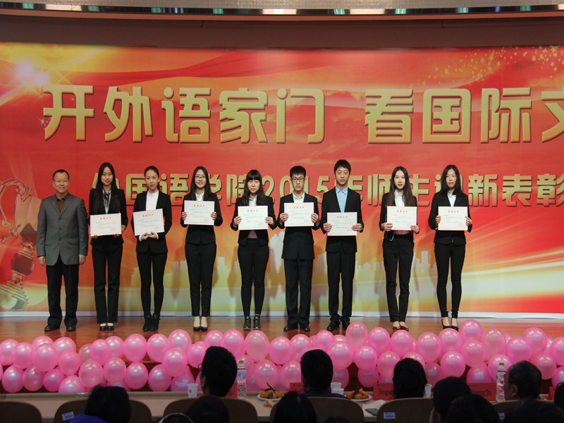 大會播放了“2014-2015年度優秀外語人表彰集錦”視頻,從學生、專業教師、導師、輔導員、班主任多角度,展現了全院全員育人所取得的成績榮譽,優秀學生代表以“人生在勤Life lies in diligence”、“習慣使你堅持 Habit is what keeps you going”、班主任以“你們的蓬勃朝氣是我工作的源動力 Your vitality is my motivation”等中英座右銘貫穿視頻,回顧了德才兼備、品學兼優學生背后的成長故事。與會領導為榮獲國家級、市級、校級先進集體和優秀個人、五早先鋒代表頒獎。本年度,學院共有11人獲得市級以上獎項,64人獲得校級獎學金,21人獲得校級榮譽稱號,28人獲得五早先鋒榮譽稱號。苗天順、楊增成、孔海龍、史巖林獲班主任勤勉獎。
