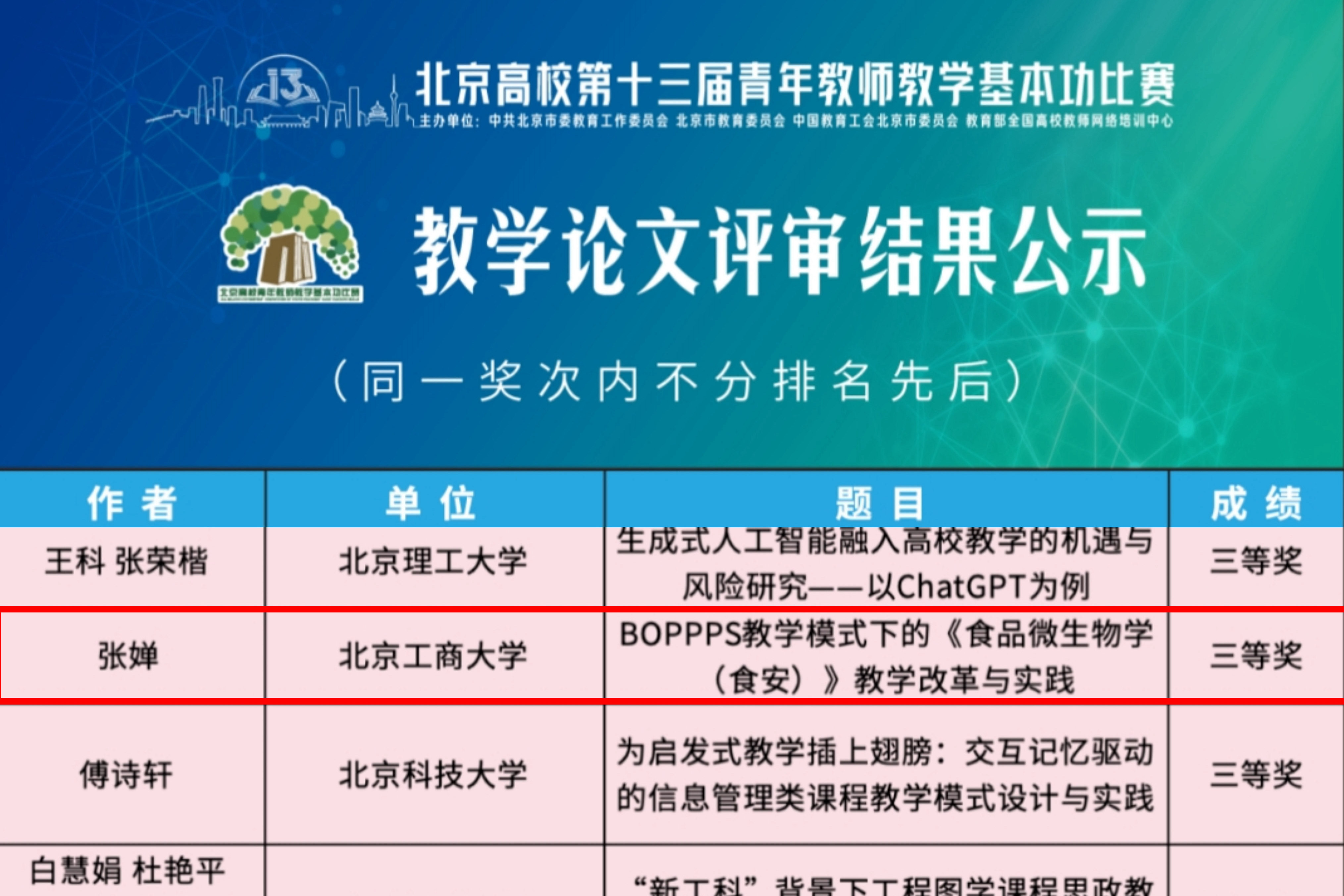 近日,北京高校第十三屆青年教師教學基本功比賽教學論文評比結果揭曉,我校計算機與人工智能學院張海艷的論文《基于虛擬仿真的三段式電流保護教學》榮獲二等獎,食品與健康學院張嬋的論文《BOPPPS教學模式下的<食品微生物學(食安)>教學改革與實踐》榮獲三等獎,這是我校教師首次在此項比賽中獲得二等獎,實現了在此賽事上的歷史性突破。