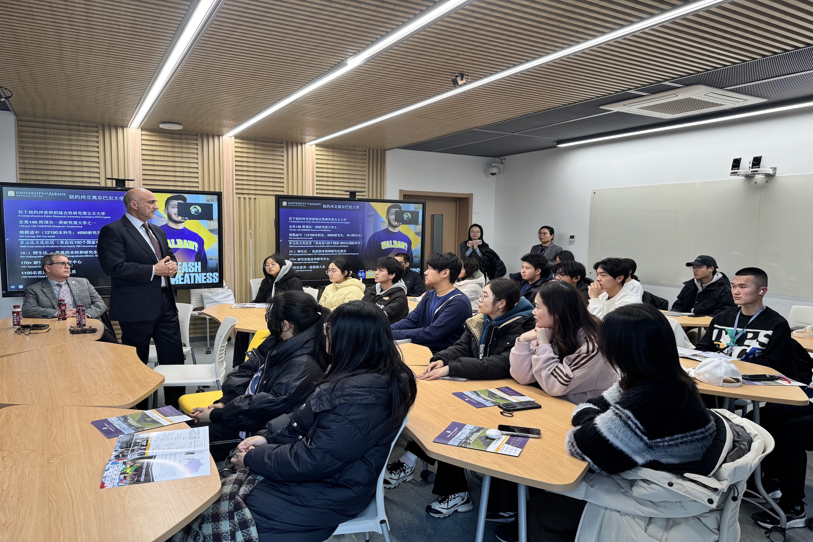 會談結(jié)束后,薩奈·法丁副校長一行為我校學(xué)生舉行了項目宣講會,詳細介紹了美國紐約州立奧爾巴尼大學(xué)的學(xué)校概況及雙方擬開展的相關(guān)學(xué)生交流項目的情況,回答學(xué)生關(guān)心的問題,并與學(xué)生們進行了深入的交流。