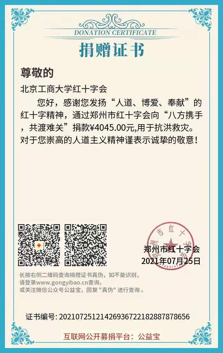 洪水無情,人有情。在得知河南受災(zāi)后,我校紅十字會學(xué)生分會立即與北京紅十字會取得聯(lián)系,主動了解河南災(zāi)區(qū)受災(zāi)情況及捐贈事宜,發(fā)揚“一方有難,八方支援”的人道主義精神,積極動員紅十字會會員,迅速組織開展了募捐活動。截止目前,共有57位老師和同學(xué)參與我校紅十字援助河南募捐活動,累計收到愛心捐款4045元。