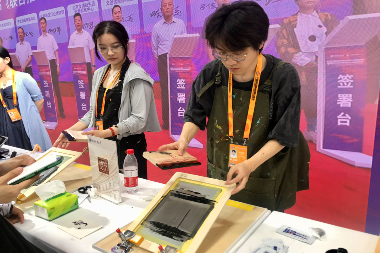 傳媒與設計學院和徐悲鴻紀念館還在本次服貿會上共同組織了“絲網印刷手工DIY”互動活動。學院師生現場為觀展市民演示手工制作精美文創的全部過程,吸引眾多觀眾駐足,在互動實踐中增進廣大市民對中華傳統文化的了解與熱愛。
