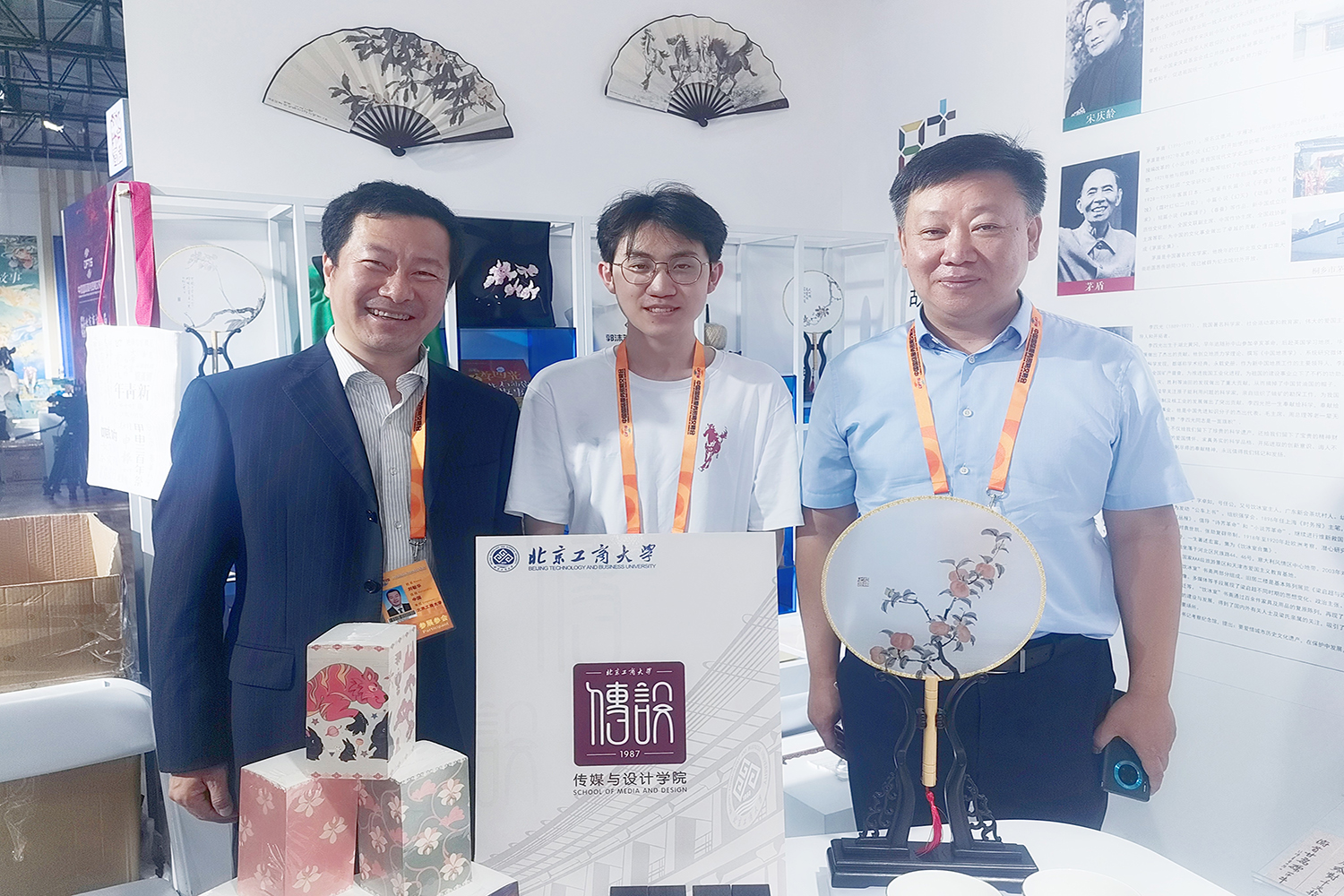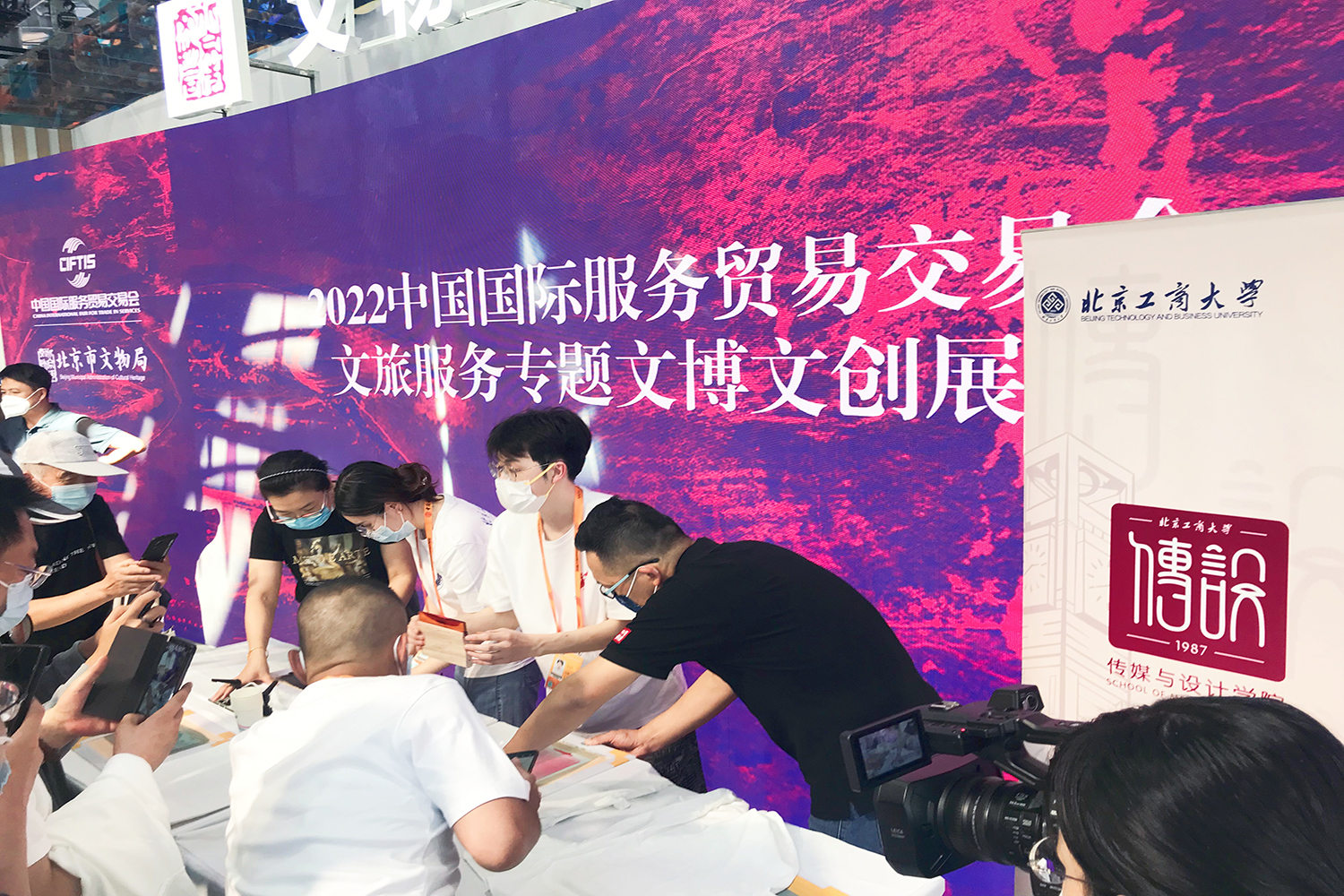 傳媒與設計學院設計的文創產品同時亮相本屆服貿會文旅服務專題文博文創展區。黨委常委、副校長劉敏華、左敏在服貿會相關專題活動結束后,親臨文創展區指導工作。