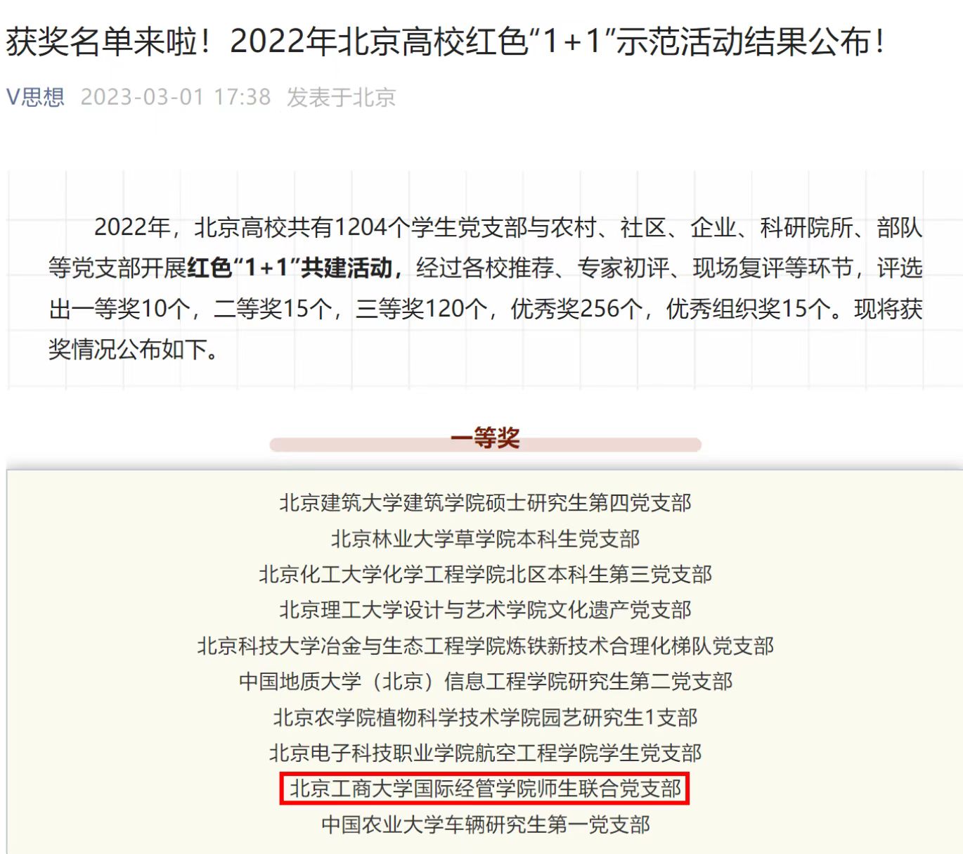 近日,北京市委教育工委公布了2022年北京高校紅色“1+1”示范活動評比結(jié)果,北京高校共有1204個學(xué)生黨支部與農(nóng)村、社區(qū)、企業(yè)、科研院所、部隊等黨支部開展紅色“1+1”共建活動,經(jīng)過各校推薦、專家初評、現(xiàn)場復(fù)評等環(huán)節(jié),我校5支黨支部獲得市級獎勵。國際經(jīng)管學(xué)院師生聯(lián)合黨支部從北京高校1204個黨支部中脫穎而出,斬獲一等獎,經(jīng)濟(jì)學(xué)院金融本科生黨支部榮獲三等獎,生態(tài)環(huán)境學(xué)院研究生專碩黨支部、商學(xué)院人力營銷本科生黨支部、輕工科學(xué)技術(shù)學(xué)院生物工程本科生黨支部獲得優(yōu)秀獎。