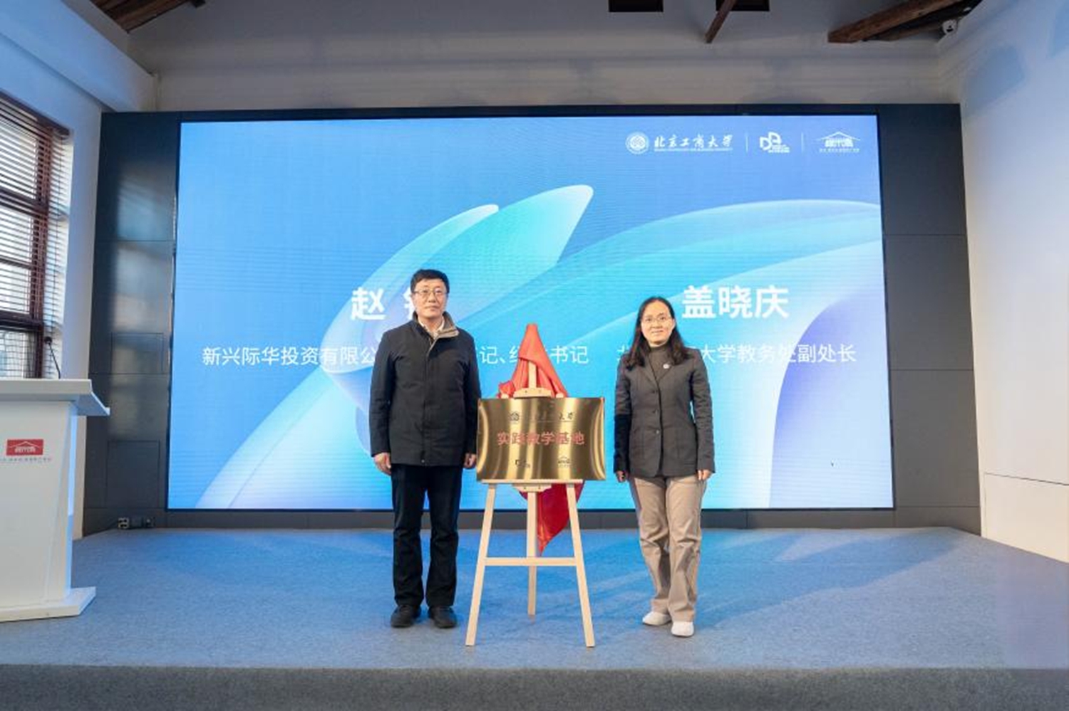 學(xué)校教務(wù)處副處長蓋曉慶與新興際華投資有限公司黨委副書記、紀(jì)委書記趙銘共同為實(shí)習(xí)實(shí)踐基地揭牌。揭牌儀式后,校企雙方圍繞“北京工商大學(xué)服務(wù)行業(yè)及首都發(fā)展”開展座談交流。