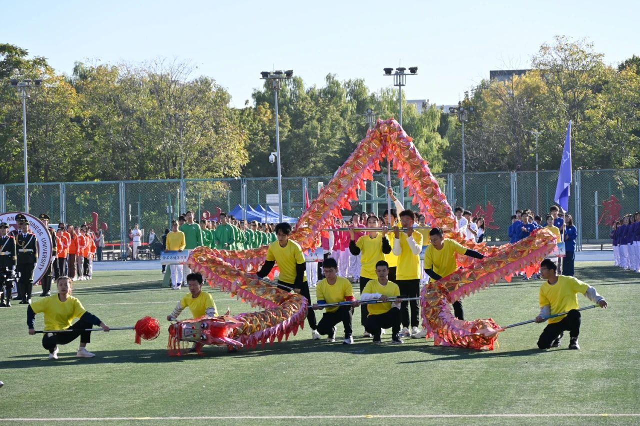 鑼鼓喧天聲聲昂,雙龍戲珠沖云霄。我校舞龍隊帶來精彩絕倫的表演。隊員們手持游龍,振臂有力,步履協調。握、捻、轉、搖一套動作干凈有力、行云流水。兩條游龍在霽藍的賽道上騰空躍起,象征著北京工商大學將如巨龍般騰飛躍進。