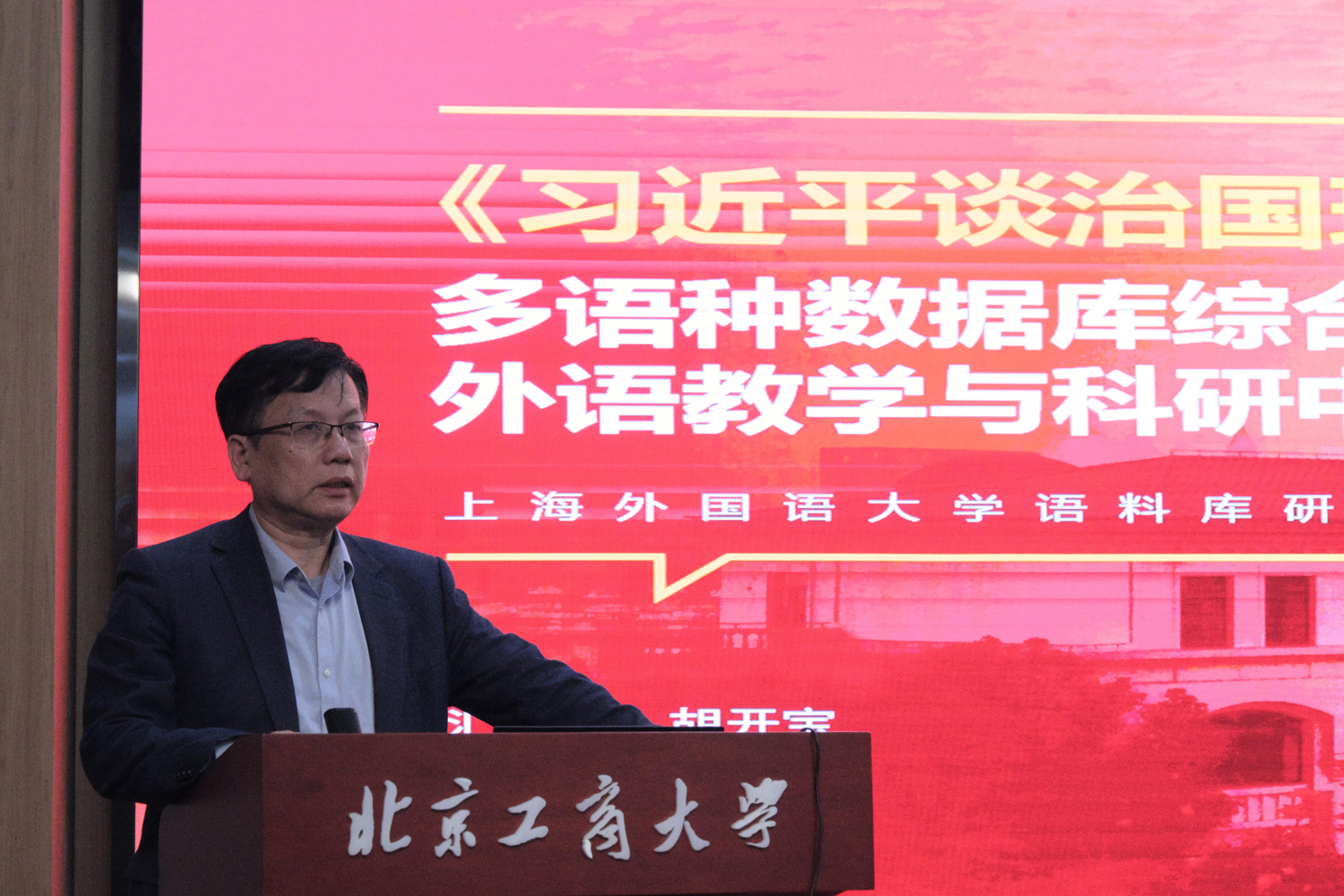 研討會分為開幕式、專家報告和主旨發言三個環節。開幕式由語言與傳播學院院長王擎教授主持。學校黨委副書記宋曉欣、上海外語教育出版社北京文化發展中心主任楊屹立致辭。專家報告和主旨發言由語言與傳播學院副院長史巖林主持。上海外國語大學語料庫研究院院長、教育部國家重大人才計劃特聘教授,國家社科基金重大項目首席專家胡開寶教授、上海外國語大學語料庫助理研究員李曉倩博士作專家報告。語言與傳播學院關濤、吳濛、劉思含、苗天順作主旨發言。語言與傳播學院黨委書記劉影作總結發言。