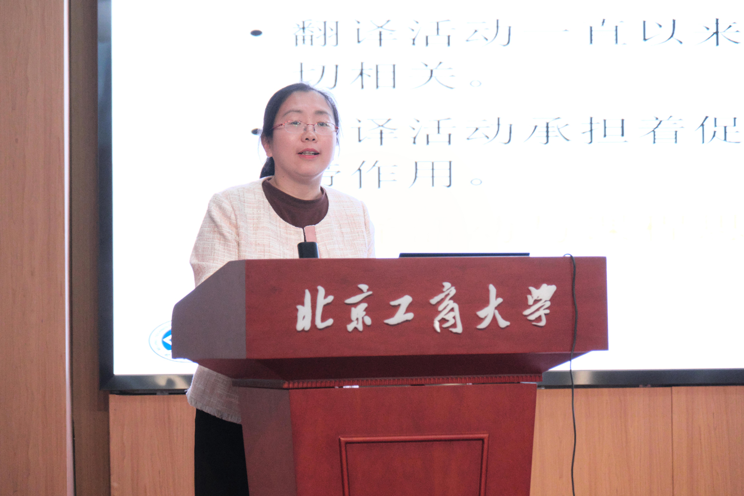 在主旨發言環節,語言與傳播學院關濤副教授以“《習近平談治國理政》多語種數據庫綜合平臺助力大學英語課程思政——以北京工商大學為例”為題進行匯報。吳濛副教授以“《習近平談治國理政》多語種數據庫綜合平臺在大學英語‘三進’工作中的實踐路徑探索”為題進行匯報。劉思含老師進行“語料庫賦能筆譯課程思政教學一以扶貧主題翻譯為例”的匯報。苗天順副教授進行“人工智能賦能外語課程思政構建”的匯報。胡開寶教授對4位教師的匯報分享作點評發言,他充分肯定了語言與傳播學院英語教學的探索實踐,并對語料庫助力教學科研的未來作出了規劃指導。