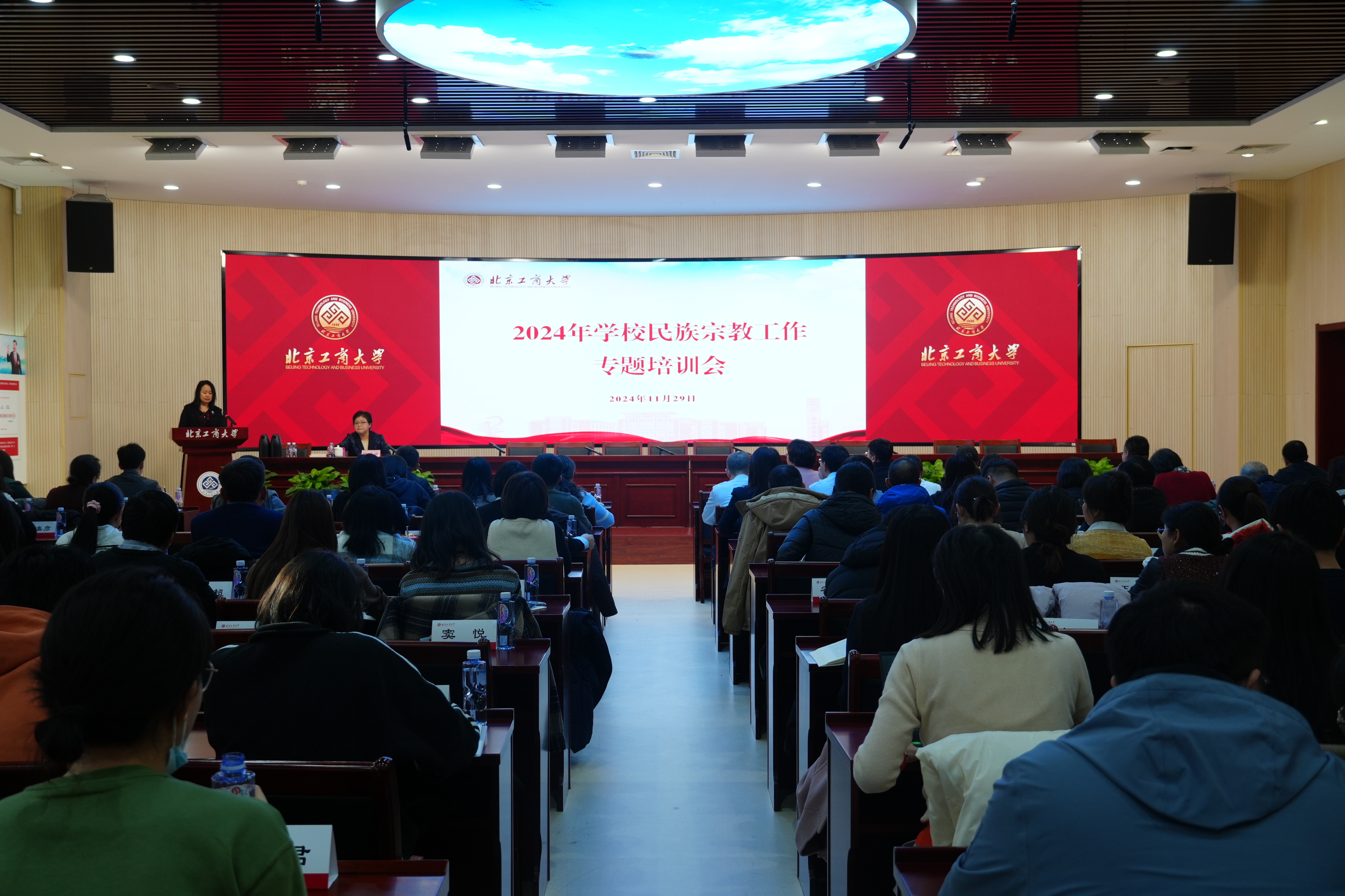 為深入學(xué)習(xí)領(lǐng)會(huì)習(xí)近平總書(shū)記關(guān)于做好新時(shí)代黨的統(tǒng)一戰(zhàn)線(xiàn)工作的重要思想,貫徹落實(shí)好中央民族工作會(huì)議精神和全國(guó)宗教工作會(huì)議精神,切實(shí)提升基層組織和干部隊(duì)伍推動(dòng)工作的能力素質(zhì),11月29日,學(xué)校舉辦2024年民族宗教工作專(zhuān)題培訓(xùn)會(huì)。北京市民族宗教事務(wù)委員會(huì)黨組成員、副主任陳婷婷受邀作專(zhuān)題報(bào)告。學(xué)校統(tǒng)戰(zhàn)工作領(lǐng)導(dǎo)小組和民族宗教事務(wù)工作領(lǐng)導(dǎo)小組成員單位負(fù)責(zé)人,二級(jí)黨組織書(shū)記、統(tǒng)戰(zhàn)委員,各學(xué)院副書(shū)記、輔導(dǎo)員,專(zhuān)職組織員,學(xué)校黨委教師工作部、黨委學(xué)生工作部、黨委研究生工作部、黨委保衛(wèi)工作部、公共事務(wù)處等部門(mén)負(fù)責(zé)人和干部,新入職教職工、馬克思主義學(xué)院專(zhuān)任教師、師生黨支部書(shū)記代表等140余人參加培訓(xùn)。培訓(xùn)由學(xué)校黨委副書(shū)記宋曉欣主持。