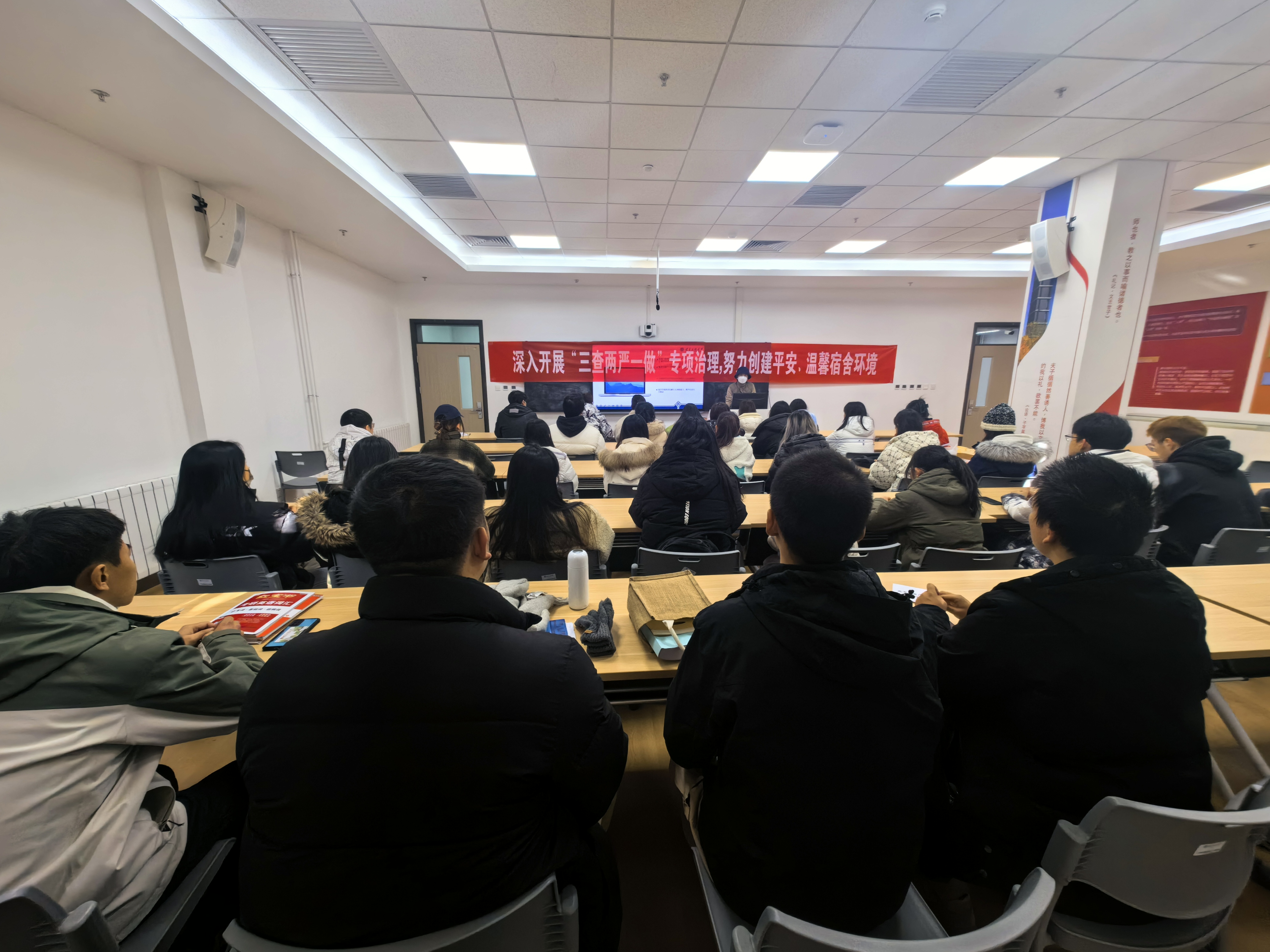 在專項治理行動前期,公共事務處對宿舍樓公共區域消防通道進行檢查和清理;保衛處在兩校區制作了宿舍消防安全展板、海報,對宿舍樓內的消防設施進行了全面檢查,及時排除有關設備故障;各學院通過召開主題班會、觀看宿舍消防安全宣傳視頻、專題討論等形式,做好宿舍消防安全宣傳動員,讓學生了解宿舍常見火災原因,學習防范火災技能。
