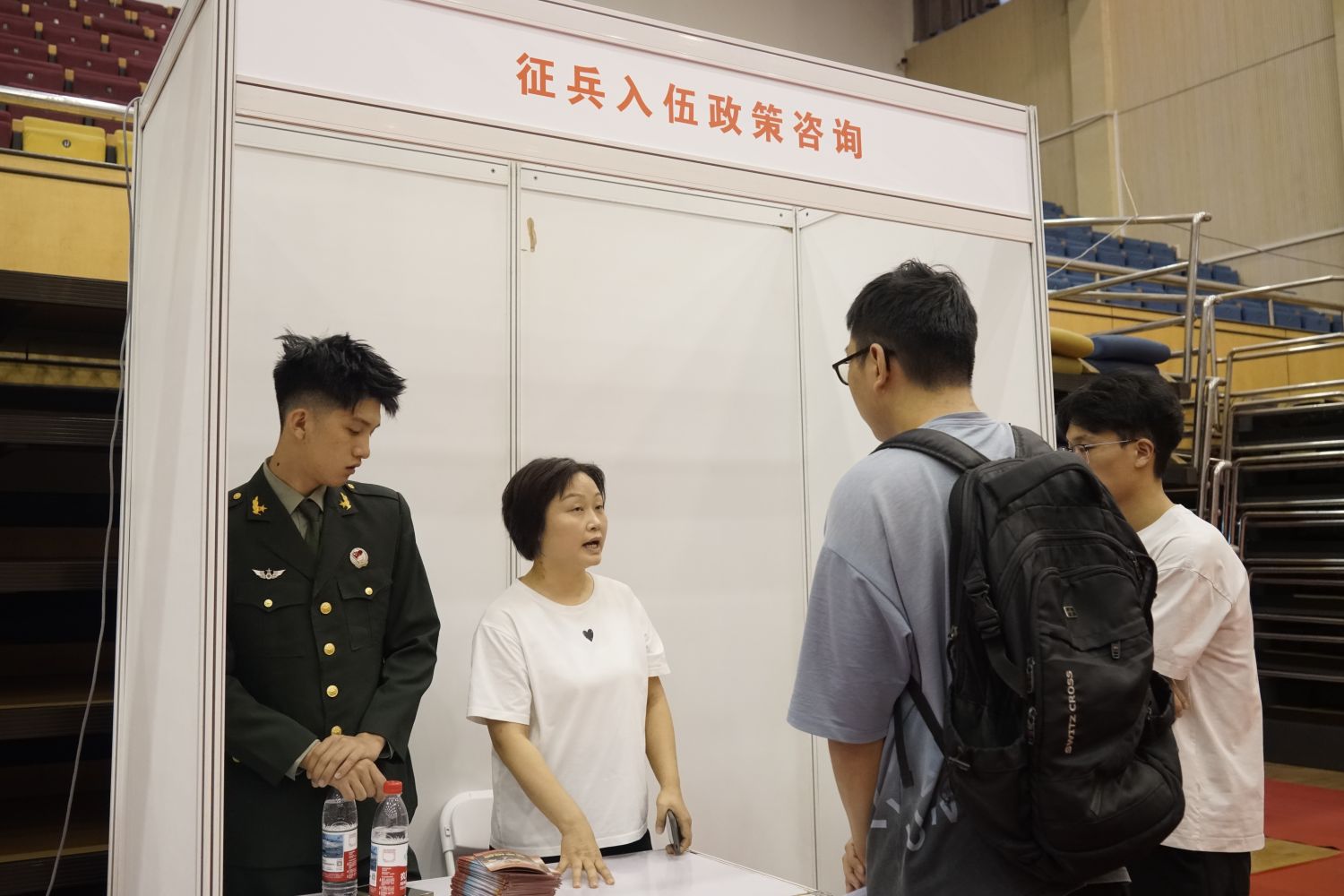 在雙選會現(xiàn)場,“北京市高校就業(yè)指導服務(wù)站專區(qū)”的亮相格外引人注目,吸引了大量學生前來關(guān)注,成為雙選會的一大亮點。我校作為北京市高校首批就業(yè)創(chuàng)業(yè)指導服務(wù)站建設(shè)試點單位,與北京市就業(yè)促進中心、房山區(qū)人力資源和社會保障局等聯(lián)合打造了“就業(yè)指導服務(wù)站專區(qū)”,為學生們現(xiàn)場帶來簡歷指導、就業(yè)政策咨詢、征兵入伍政策咨詢、公招政策解讀、出國留學咨詢和就業(yè)技能培訓等一系列貼心指導和服務(wù)。在簡歷指導展位前,學生們排起了長隊,紛紛針對手中的簡歷仔細聆聽咨詢老師給予的貼心修改建議。在就業(yè)政策咨詢臺,來自房山區(qū)人保局畢業(yè)生就業(yè)服務(wù)科的工作人員為學生們耐心解答著關(guān)于公招政策、創(chuàng)業(yè)和靈活就業(yè)保險政策、鄉(xiāng)村振興協(xié)理員報名等各方面的咨詢問題。在征兵入伍政策咨詢臺,我校武裝部老師和退伍學生骨干針就學生關(guān)心的征兵入伍政策進行詳細解讀,積極回應(yīng)學生關(guān)切問題,鼓勵青年學子攜筆從戎,建功軍營。