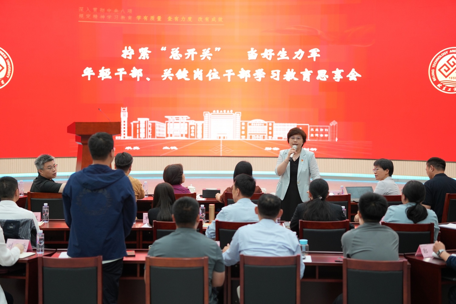 6位年輕干部、關鍵崗位干部代表進行重點發言。計劃財務處處長呂素香立足財務工作分享了守好“紀律紅線”、筑牢“廉潔防線”、護航“發展一線”的學習心得;審計處處長李剛談到,要當好“守護者”和“清醒者”,做“眼里有光、心里有戒、手里有招”的審計人;網絡與信息化管理中心主任張珣以“明初心、礪作風、擔使命”為主題詞,提出要以焦裕祿精神為鏡,鍛造新時代信息化服務鐵軍;黨政辦公室副主任張揚將學習教育成果融入日常實踐,闡釋了如何在工作中堅持“一個中心”,重點把好“三關”,做好上傳下達、切實服務師生;發展規劃處副處長毛敏認為,厚植為民心、鍛造實干力、淬煉抗壓志是新時代年輕干部的成長三境,要以學為基、以干為要,不斷磨礪自我、提升境界;人才工作辦公室主任于明哲結合履職以來的三件重點工作,表達了年輕干部以實際行動為“忠誠 干凈 擔當”的新時代黨員干部底色增加新注解的拳拳之心。