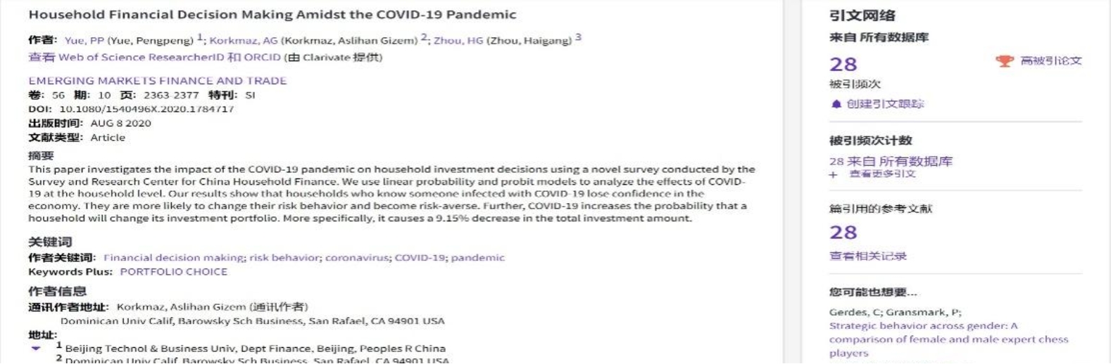 學院以制度化的方式,從學術交流、論文發表等多方面為青年教師提供支持。截至目前,2021年“鯤鵬計劃”已培育發表A類論文50余篇,青年教師岳鵬鵬博士以北京工商大學為第一單位發表在Emerging Markets Finance and Trade期刊上的論文成功入選Economics & Business領域全球前1%ESI高被引論文。