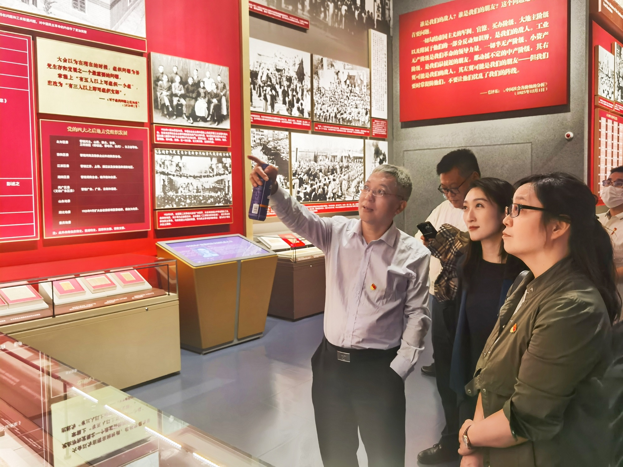大家認真參觀了“不忘初心、牢記使命”大型主題展覽。展覽共分為“建立中國共產黨奪取新民主主義革命偉大勝利”“成立中華人民共和國進行社會主義革命和建設”“實行改革開放開創和發展中國特色社會主義”和“推進中國特色社會主義進入新時代全面建成小康社會開啟全面建設社會主義現代化國家新征程”四個部分。一幅幅圖片、一件件文物實物,全方位展現了中國共產黨百年奮斗所取得的偉大歷史成就。參觀過程中,大家認真觀看,不時駐足凝望、交流探討,在珍貴的歷史文物、檔案資料、影音圖片及復原場景中,共同重溫中國共產黨波瀾壯闊、蕩氣回腸的百年歷史,感悟中國共產黨人篳路藍縷、艱苦奮斗的征程。李中奇與老師們全程參觀學習了全部展廳,就可用于思政課教學的重要史實資料與老師們進行了溝通研討。
