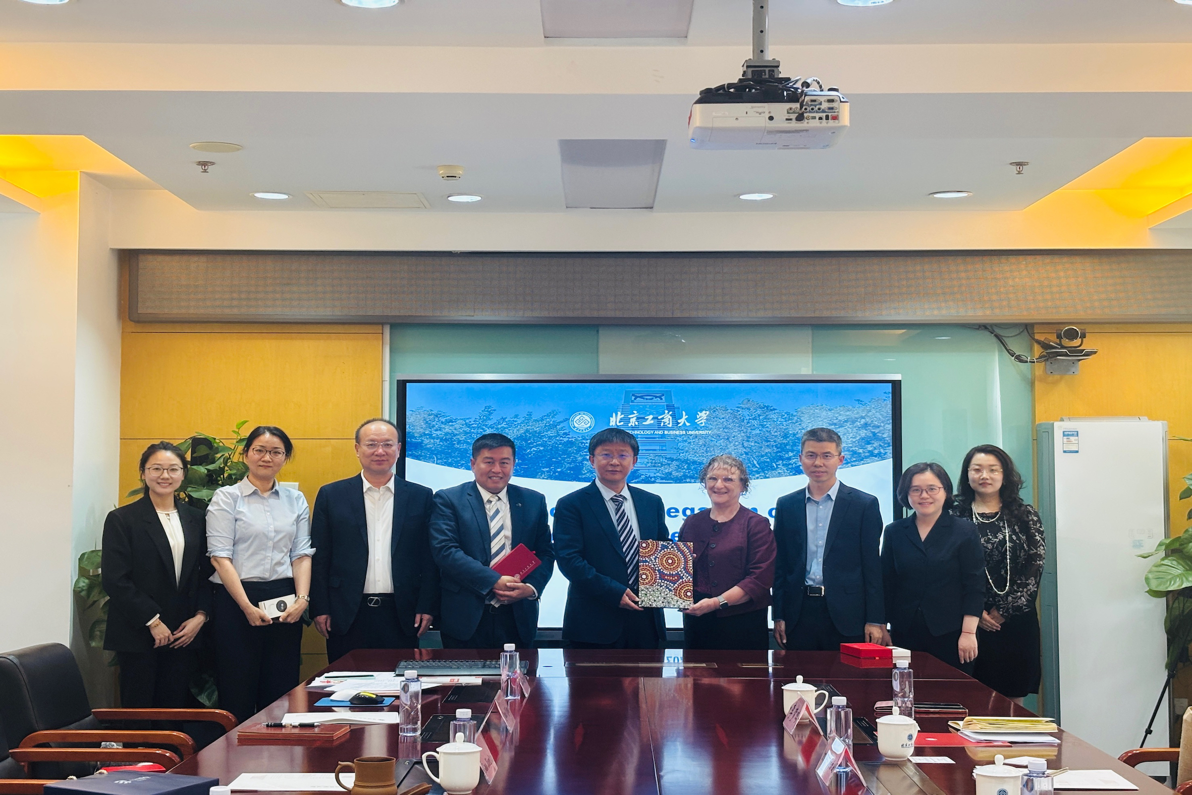 郭建華對凱倫·納爾遜教授一行蒞臨學校交流表示歡迎。他介紹了學校的發展歷程、人才培養、科學研究和學科建設方面的相關情況,同時向凱倫校長介紹了學校“工商一體化”的理念和實踐。他表示北京工商大學和澳大利亞南昆士蘭大學在優勢專業領域相同相近,兩校建立合作關系以來,雙方取得了一系列的合作進展,希望未來兩校能夠進一步深化合作,在國際化人才培養、國際化科研合作等方面產出標志性的成果。