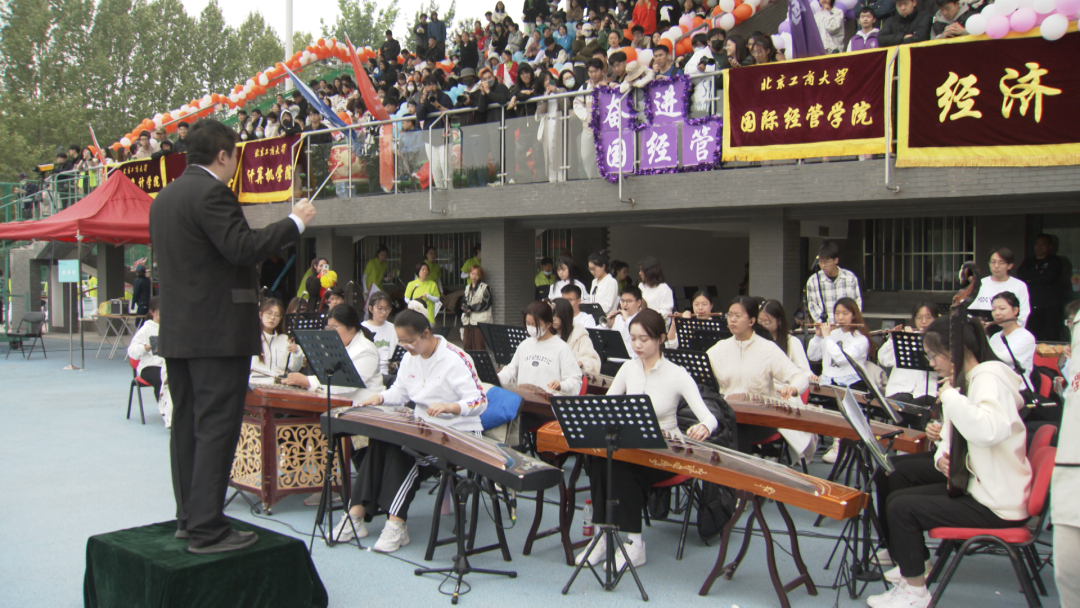 校民樂團演奏曲目《金蛇狂舞》,合唱團合唱《北京工商大學校歌》。
