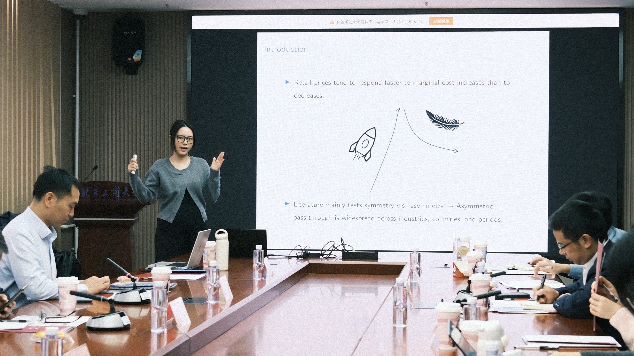 人民大學呂媛老師報告了論文“Asymmetric Pass-Through and Competition”,該文以希臘2010年三次消費稅上升和2012年一次消費稅下調為外生成本沖擊,選取37個具有獨立市場特征的希臘島嶼為研究場景,通過雙重差分法等方法,探究零售汽油市場的非對稱價格傳導現象及競爭的影響。結果發現:零售價格對消費稅上升的傳導更快,對消費稅下調的傳導更慢;競爭加劇了稅收上升時的價格傳遞,但對稅收下降時的傳遞沒有影響;消費者搜索行為是這一現象的關鍵驅動機制,而非共謀。王愛萍老師進行了點評,她建議系統地將結果與現有理論進行對話,說明本文在何種程度上推進了搜索成本這一理論機制的解釋,并明確競爭的度量。