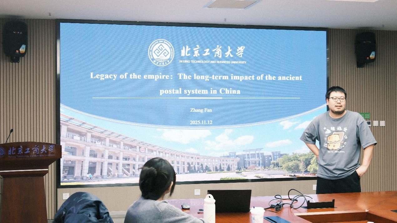 北京工商大學張凡老師報告了論文“Legacy of the Empire:The Long-term Impact of the Ancient Postal System in China”。論文基于手工整理明代驛站驛道分布數據,繪制相關地圖并匹配多元歷史、地理數據,構建微觀柵格尺度獨特數據集,通過識別該系統的本地效應與溢出效應評估長期影響。研究發現,古代交通設施的長期影響依然成立,由本地效應和溢出效應共同構成,周邊區域亦能受益,其影響源于對現代交通設施形成及古代城市發展的路徑依賴,且時間趨勢穩定。栗雅欣老師進行了點評,她建議增加河流對比,以增強結論的說服力。