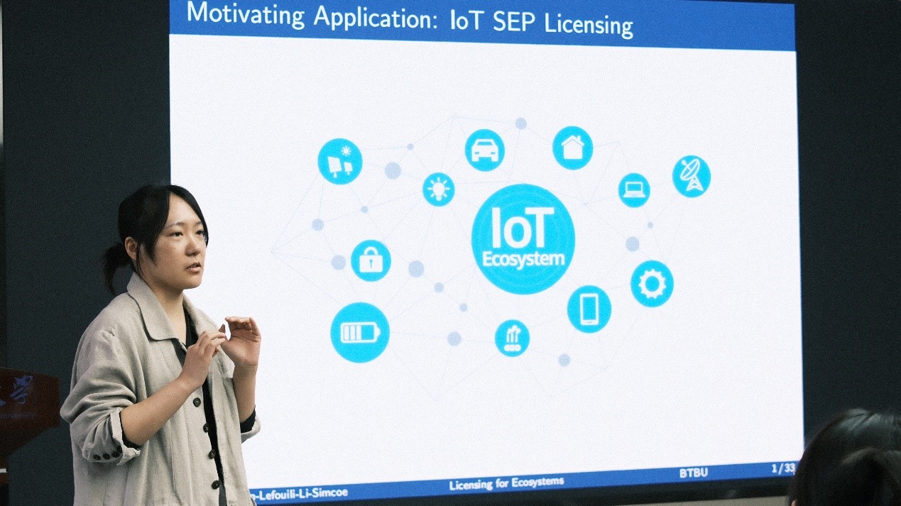 人民大學栗雅欣老師報告了論文“Licensing for Ecosystems”,研究圍繞生態系統專利許可定價展開,以華為向日本中小企業收專利費、高通跨領域布局等作為案例,指出當一項專利涉及多個互補產品時,壟斷性的生態系統定價可能比零定價帶來更高的社會福利。當存在多個互補平臺時,會導致“專利費堆疊”,但這可能反常地降低某些設備的總價格。張凡老師進行了點評,他建議進一步研究專利定價策略對廠商創新策略的驅動作用,以及該創新策略進而推動廠商生態網絡發展并影響市場的反向趨勢。