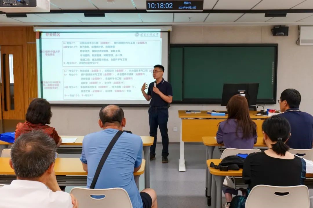學(xué)校招生就業(yè)處副處長傅磊、本科招生辦主任卜曉媛為在場的考生和家長詳細(xì)介紹了北京工商大學(xué)的基本情況、特色專業(yè)、2024年招生計劃和報考建議,并對家長們特別關(guān)注的“優(yōu)質(zhì)專業(yè)”“升學(xué)就業(yè)”相關(guān)情況進(jìn)行了講解。他們還就學(xué)校人才培養(yǎng)及畢業(yè)生就業(yè)、深造情況等方面進(jìn)行了細(xì)致分享,并以學(xué)校歷年招生數(shù)據(jù)為依托,為現(xiàn)場的考生和家長們提出了合理性、專業(yè)性兼具的建議,受到了現(xiàn)場考生與家長的肯定。