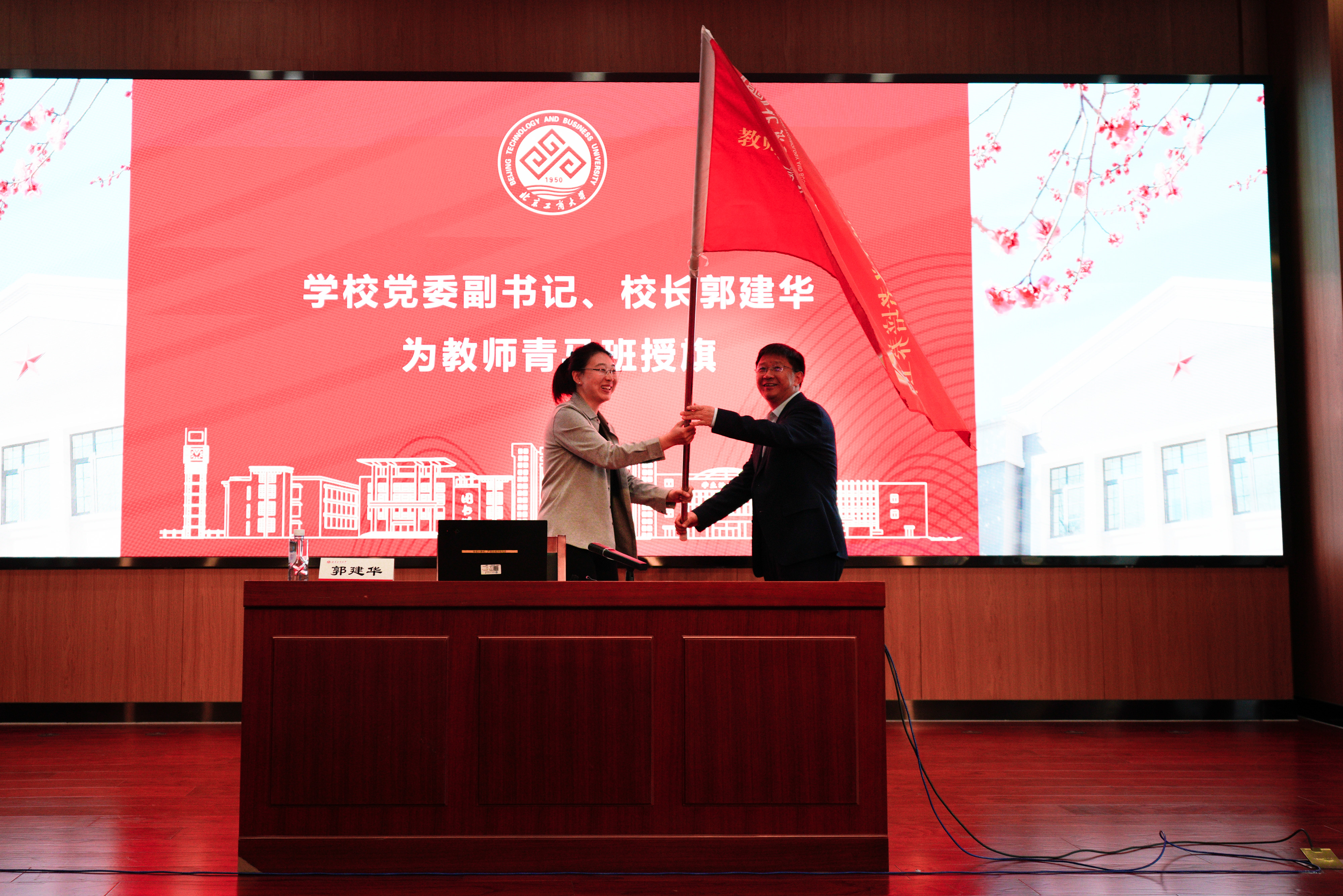 郭建華為教師青馬班授旗。他希望教師青馬班學員堅持學思踐悟有機統一,聯系學校高水平研究型大學發展實際,聯系各自工作崗位實際,將學習成效轉化為加快推進高水平研究型大學的實干擔當,譜寫新時代首都高質量發展的北工商新篇章。