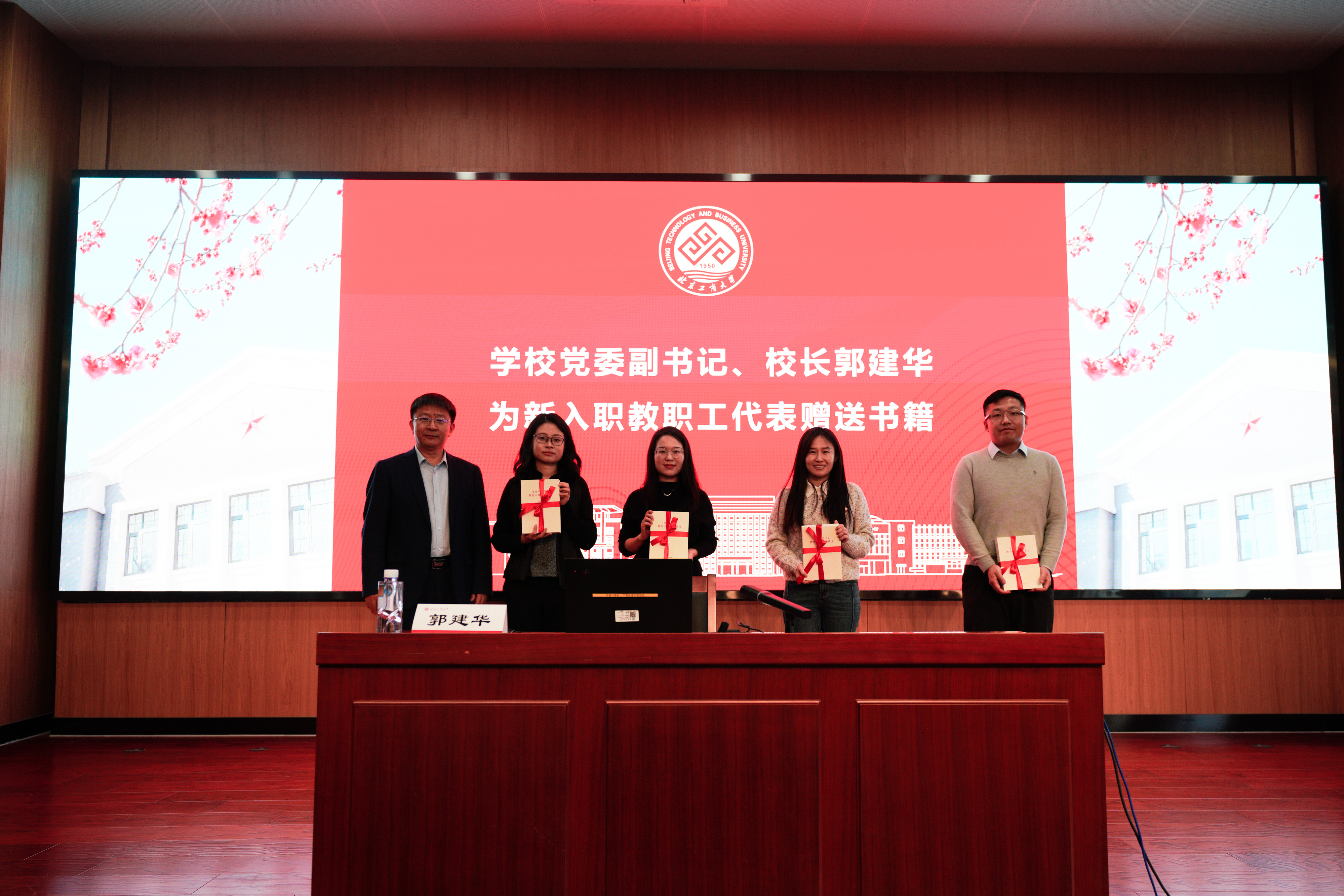郭建華為新入職教職工代表贈送《習近平總書記教育重要論述講義》一書。他希望新入職教師要堅定理想信念,強化理論學習,提高素質修養,增強能力本領,努力做政治過硬、業務精湛、作風優良的“研究型”青年教師。