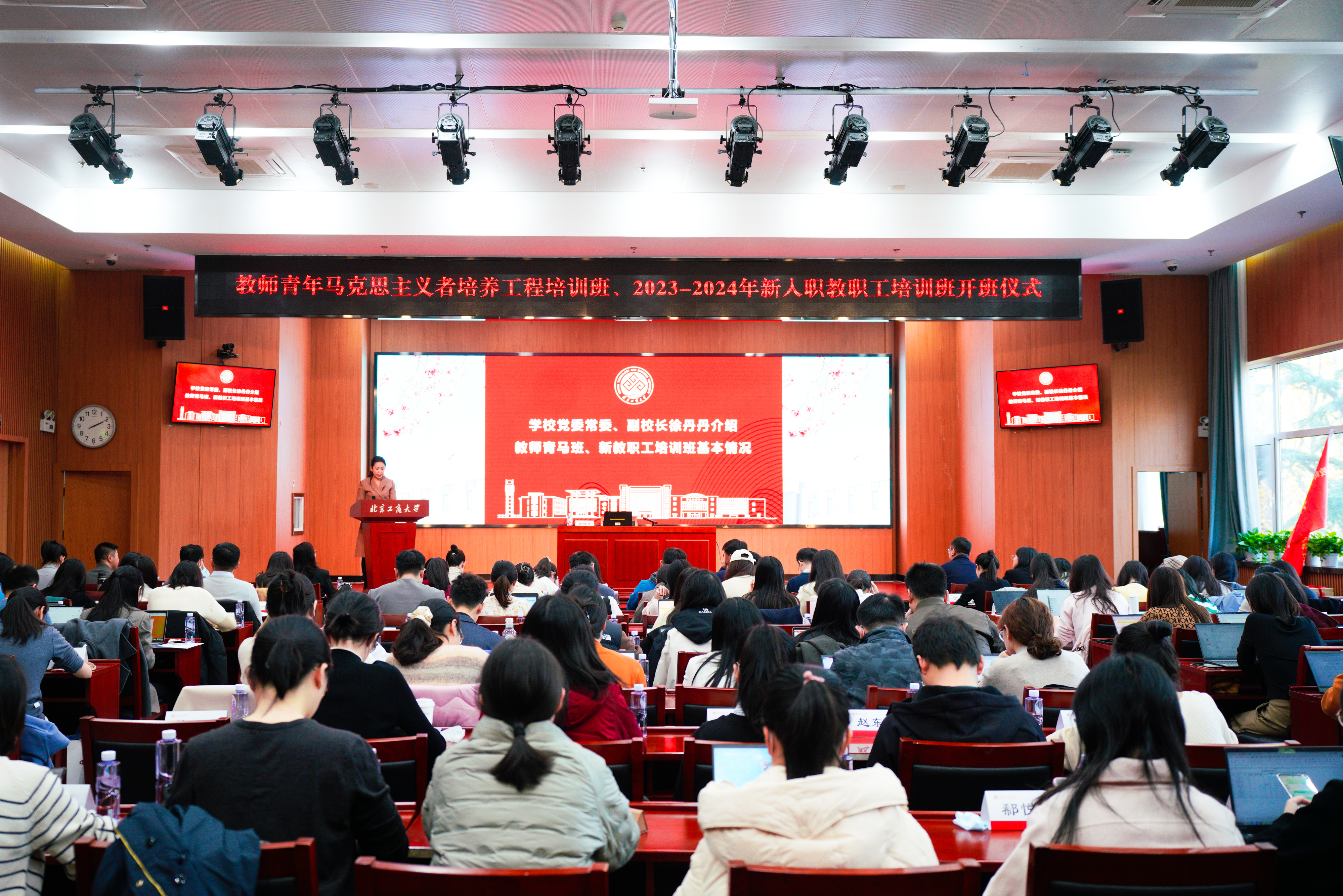 11月20日,學校教師青年馬克思主義培養工程培訓班及2023-2024年度新入職教職工培訓開班儀式在阜成路校區舉行。學校黨委常委、校長郭建華作專題輔導報告。黨委教師工作部部長、人事處處長高麗華,黨委教師工作部副部長、人事處副處長馬思瀟,教師發展中心主任王鑫鑫參加儀式,教師青馬班及新入職教職工共120余人參加培訓。開班儀式由黨委常委、副校長徐丹丹主持。