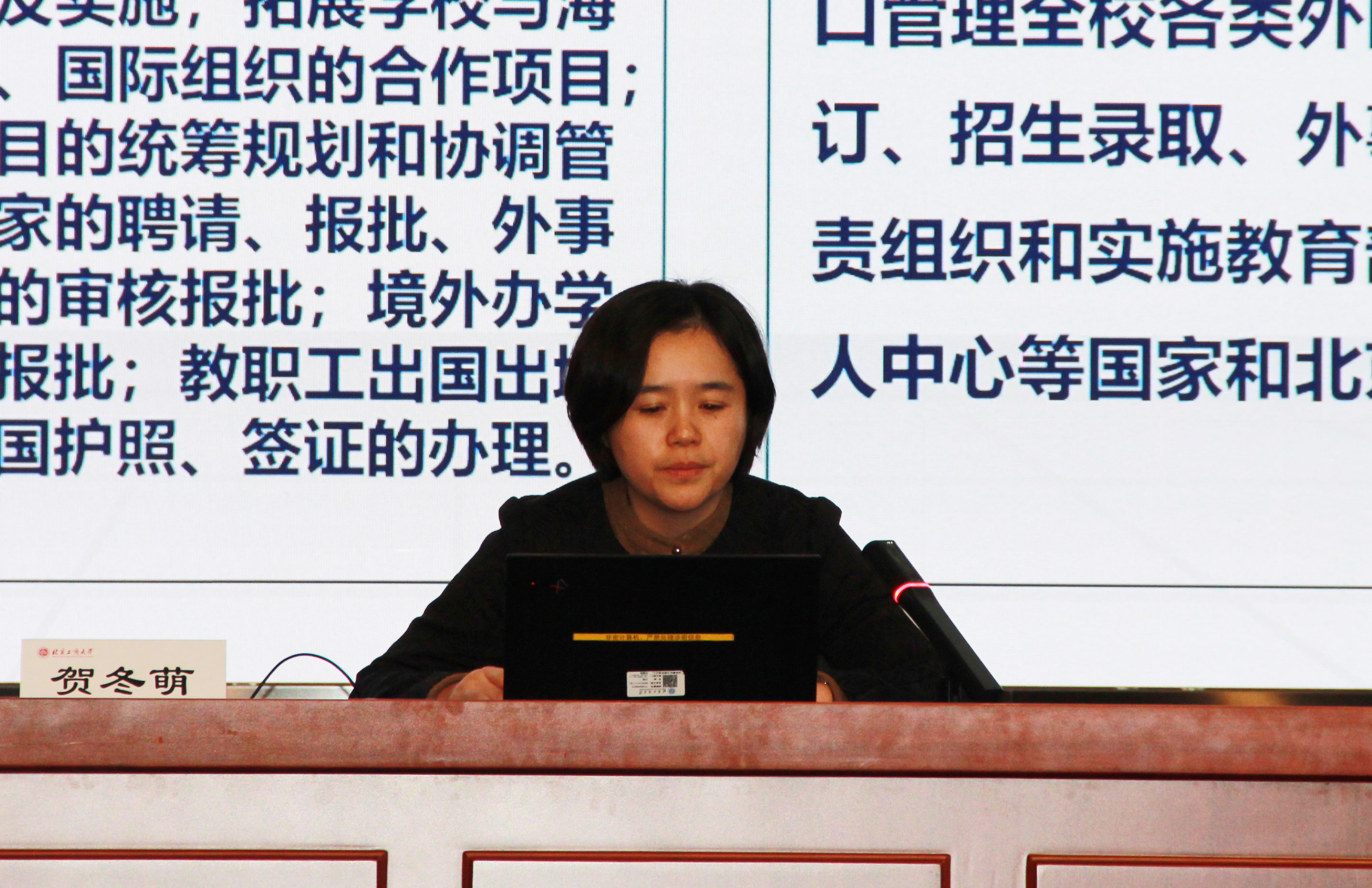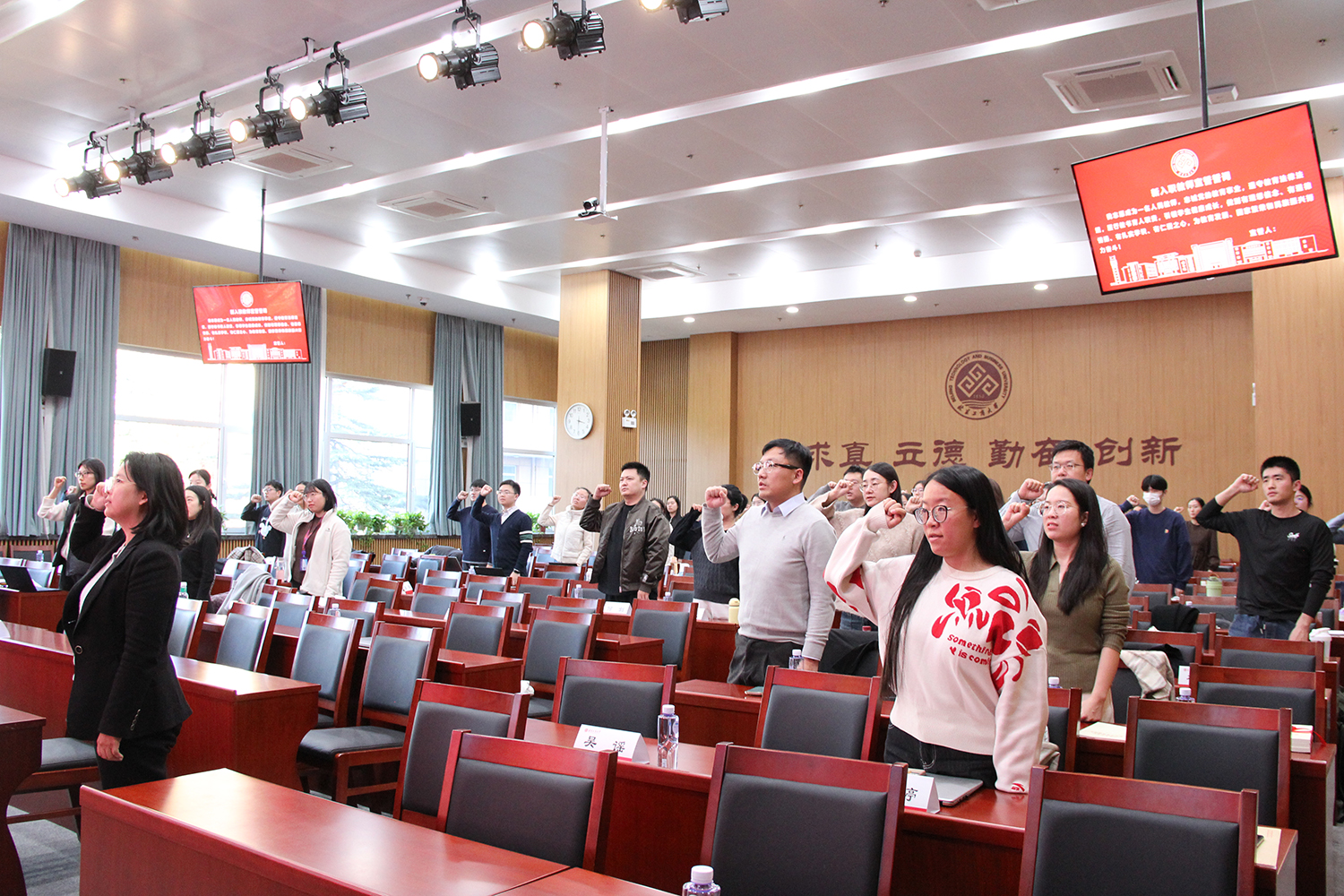 在新入職教職工代表的帶領下,全體起立,進行了莊嚴的師德宣誓:忠誠黨的教育事業,遵守教育法律法規,履行教書育人職責,引領學生健康成長,做到有理想信念、有道德情操、有扎實學識、有仁愛之心,為教育發展、國家繁榮和民族振興努力奮斗!校內培訓活動在全體合唱《北京工商大學校歌》中圓滿落下帷幕。