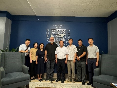 在芝加哥訪問期間,黨委書記黃先開一行先后訪問了美國伊利諾伊大學芝加哥分校和美國多米尼加大學。在伊利諾伊大學芝加哥分校訪問期間,代表團一行與該校國際部舉行項目會談,雙方回顧了2022年雙方建立校級合作關系以來所開展的交流交往以及合作成果,并就下一階段雙方在碩博層次人才培養、高層次師資交流、科研項目合作以及商科數字化教育平臺建設等內容交換了意見,并達成了初步合作意向。隨后,代表團成員在國際部項目主任Jeff Wang的陪同下參觀了校園的相關教學設施。