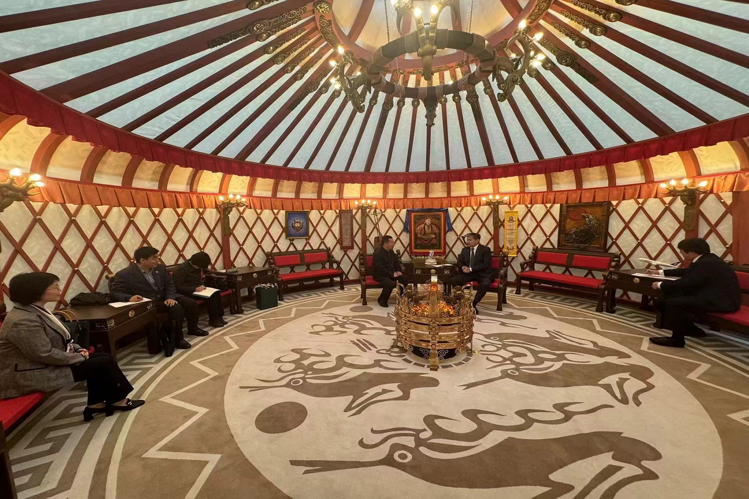 巴德?tīng)柪沾笫箤?duì)劉敏華來(lái)訪表示歡迎,他說(shuō)蒙中是山水相連的永久鄰邦,是好鄰居、好朋友、好伙伴。2022年,雙方發(fā)表《中華人民共和國(guó)和蒙古國(guó)關(guān)于新時(shí)代推進(jìn)全面戰(zhàn)略伙伴關(guān)系的聯(lián)合聲明》,兩國(guó)也一致同意將深化文化教育、科學(xué)技術(shù)、觀光旅游等領(lǐng)域交流合作,大力開(kāi)展人文交流,鼓勵(lì)教育、科學(xué)機(jī)構(gòu)之間推進(jìn)合作,促進(jìn)民心相通。今年是蒙中建交75周年,雙方正在積極籌備形式多樣的慶祝活動(dòng),增進(jìn)“鄰里心靈相通”。蒙中兩國(guó)教育交流活躍,兩國(guó)青少年通過(guò)各類(lèi)不同的教育合作項(xiàng)目開(kāi)展了廣泛的交流,成為蒙中兩國(guó)人文交流的重要組成部分。未來(lái)期待蒙古國(guó)高校能夠和北京工商大學(xué)建立相關(guān)合作,有更多蒙古國(guó)的優(yōu)秀青少年來(lái)到北京工商大學(xué)進(jìn)行學(xué)習(xí)和交流。
