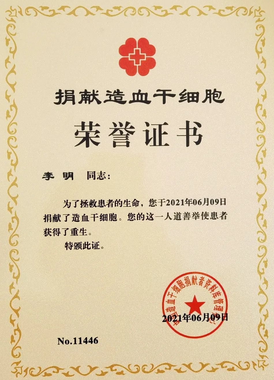 兩個月后,體檢合格的李明躺在了安徽醫科大學第二附屬醫院的病床上,溫熱的血液正從他挽起袖口的手臂中緩緩流出,進入血細胞分離機,分離出的造血干細胞將救助遠方一位罹患白血病的年輕父親。汩汩鮮血順著輸液管向上流淌,李明仿佛看到了這位父親生命的延長線。歷經5個多小時,李明成功捐獻155毫升造血干細胞混懸液,成為全國第11446位造血干細胞捐獻者。