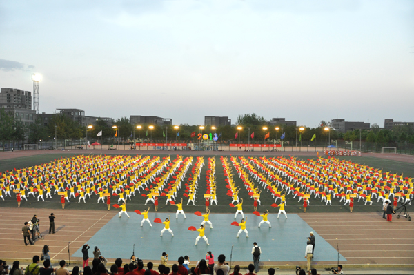 青春的節(jié)奏,讓朝氣蓬勃的大學(xué)生伴隨著樂聲在運動場上綻放出最美的年華。來自商學(xué)院、經(jīng)濟學(xué)院、藝術(shù)與傳媒學(xué)院、計信學(xué)院以及材機學(xué)院的1008名大一女生踏著歡快的啦啦操歌曲驚現(xiàn)“舞臺”。她們身著紅色和黃色制服,高舉手花,用各式各樣的隊形淋漓盡致地展現(xiàn)著“巾幗不讓須眉”的氣魄。長久的期盼在此刻化作了自信的笑容洋溢在每一位同學(xué)的臉上,她們用年輕人的青春蓬勃繪出了一幅又一幅壯美的畫卷:“小飛機”、“2013”、“花團錦簇”不斷地展現(xiàn)在觀眾的視野中。指導(dǎo)教師王立紅說,團體操的訓(xùn)練讓同學(xué)們都參與到了體育鍛煉中,看到大家這樣辛苦訓(xùn)練的成果在此刻展現(xiàn),我們真正做到了為自己加油。