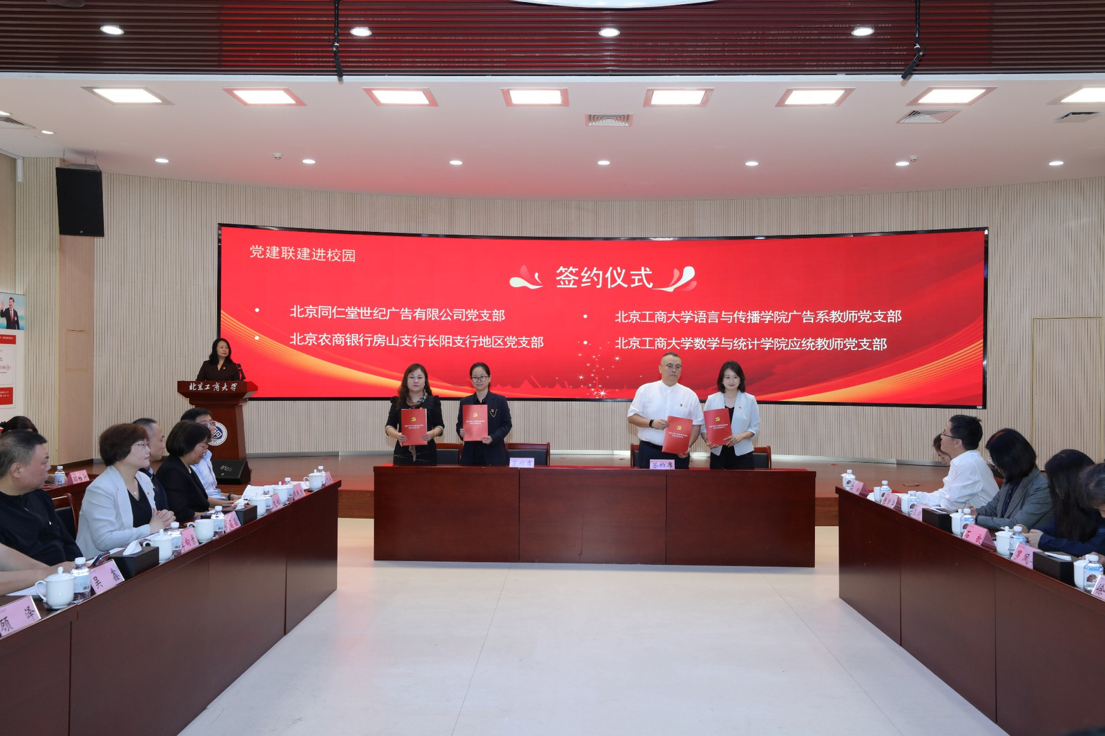 會上舉行黨建共建協議簽約儀式。經前期深度對接,學校食品與健康學院、設計與藝術學院、釀酒工程系、生物工程系、廣告系、應用統計系、食品營養與健康系、食品科學與工程系、食品質量與安全系等9個院系黨組織,分別與北京同仁堂健康藥業股份有限公司黨委、北京同仁堂股份有限公司同仁堂藥酒廠黨總支、北京同仁堂股份有限公司經營分公司黨總支、北京同仁堂世紀廣告有限公司黨支部、北京工美集團有限責任公司王府井工美大廈黨總支、北京農商銀行房山支行長陽支行地區黨支部、北京一輕研究院有限公司第三黨支部、北京一輕食品集團有限公司黨總支、北京北冰洋食品有限公司科室黨支部等9家企業黨組織達成共建意向。