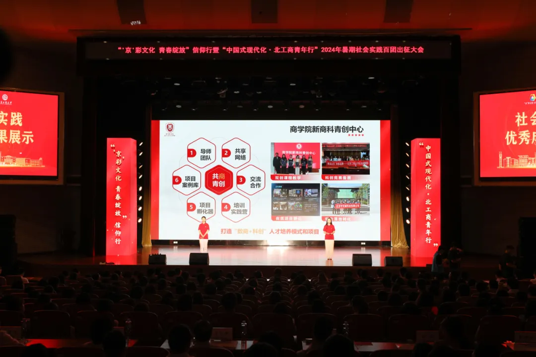 學校黨委書記黃先開,市社科院黨組成員、副院長、市委講師團團長肖峻峰,市委教育工委宣教處副處長丁貞棟,市委宣傳部理論處許倩,團市委大學部副部長王曉鷗一同上臺,共同啟動2024年“‘京’彩文化 青春綻放”信仰行暨“中國式現代化 北工商青年行”暑期社會實踐百團出征!
