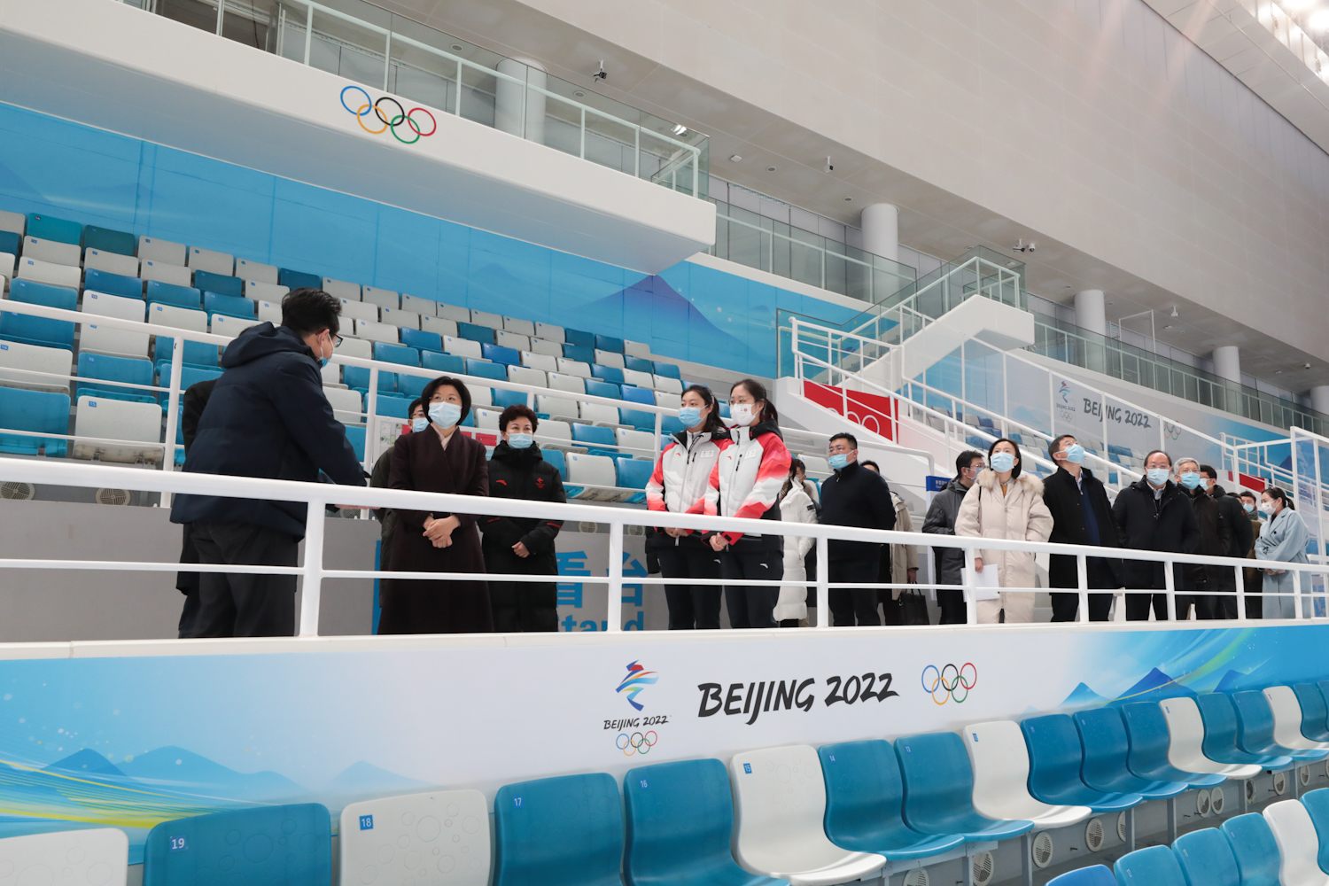 孫梅君部長還參觀了冰立方場館志愿者之家。黨委書記黃先開向孫梅君部長一行詳細介紹了我校冬奧會志愿服務保障工作。志愿者們介紹了志愿者之家的設計和構思,并展示了學校為志愿者準備的各類激勵保障物資,介紹了賽時志愿者心理疏導熱線。孫梅君部長對我校志愿者在冬奧會測試賽中的優異表現表示贊揚,對我校自冬奧會志愿服務籌備以來的各項工作予以大力肯定,并對志愿者提出三點要求:一是希望志愿者學習貫徹習近平總書記關于冬奧會籌辦的系列重要指示精神,為冬奧會提供高質量服務;二是希望冬奧賽會志愿者在賽時要展示大國風采,貢獻青春力量,在服務過程中做到“精細、精準、精致”;三是希望志愿者在冬奧會志愿服務過程中要把握機遇、不斷提升,同時也要注意勞逸結合,做好個人防護。孫梅君部長勉勵志愿者:“就像習近平總書記在新年賀詞中說的那樣 ‘我們將竭誠為世界奉獻一屆奧運盛會。世界期待中國,中國做好了準備’,希望志愿者們也做好充足的準備,展現青年風采,體現青年風貌。你們將是北京最亮眼的名片。”