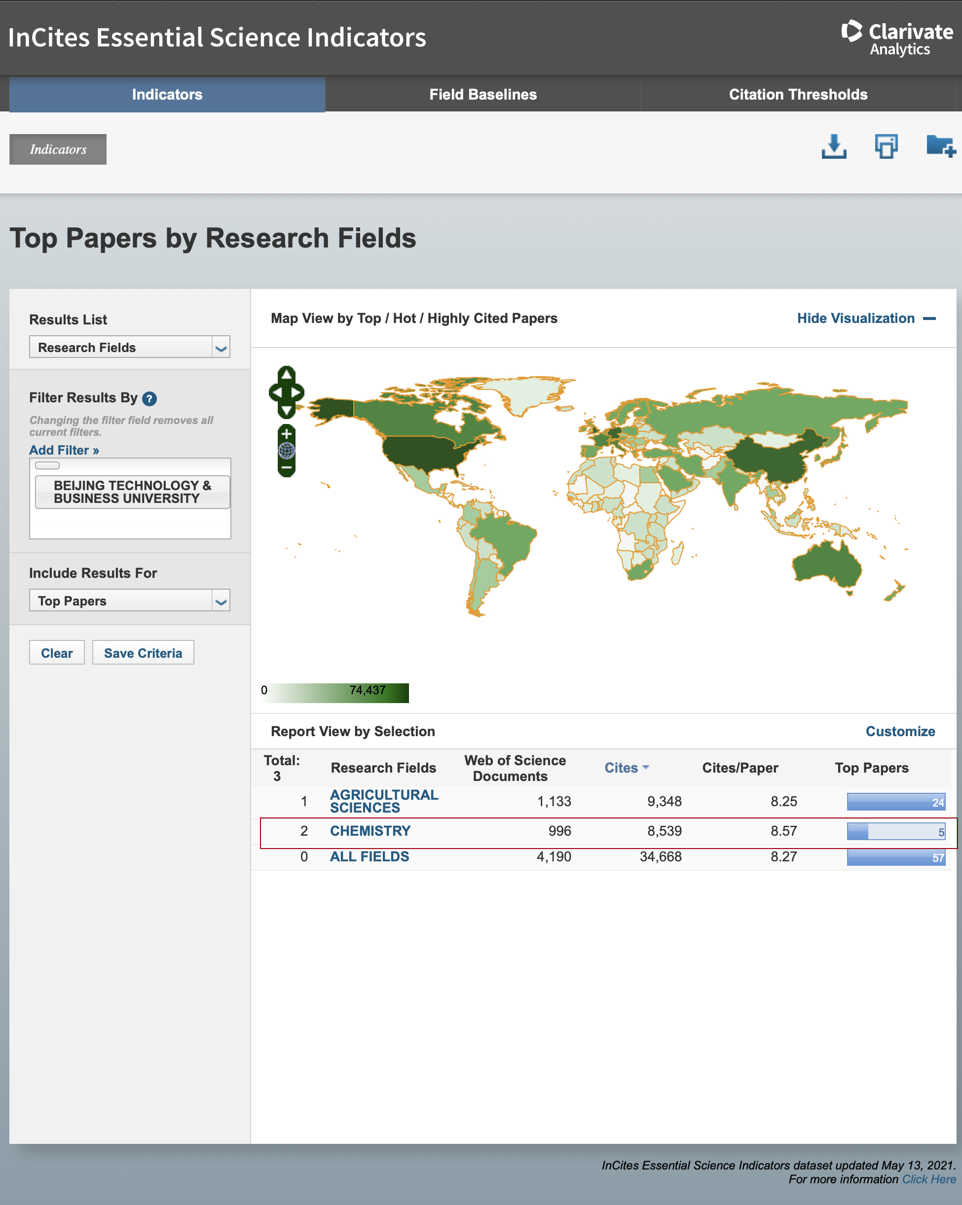 北京時間5月13日,科睿唯安(Clarivate Analytics)發布的最新一期ESI(Essential Science Indicators)數據顯示,我?!盎瘜W”(Chemistry)學科首次躋身ESI全球排名前1%,標志著我?;瘜W學科達到世界一流水平?;瘜W學科繼2019年農業科學學科首次進入ESI前1%之后,成為我校第二個進入ESI前1%的學科。