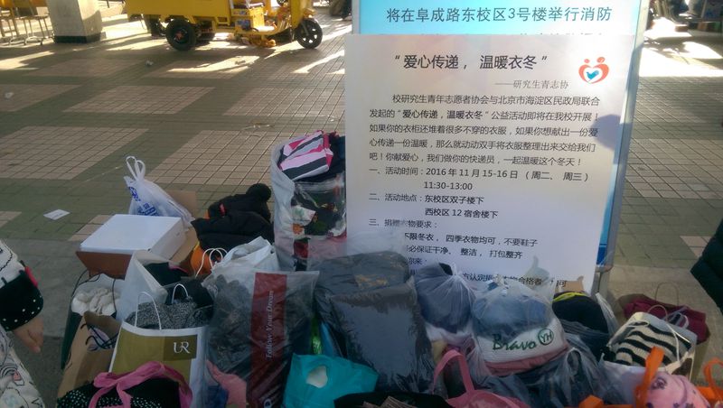 活動結束后,收集到的衣物經分類打包,通過快遞公司運送至海淀區民政局位于清河小營的捐贈中心。捐贈中心的工作人員對大家舉辦活動,獻出的愛心,表示感謝。并希望今后有更多機會,與研究生青志協一起開展愛心活動。