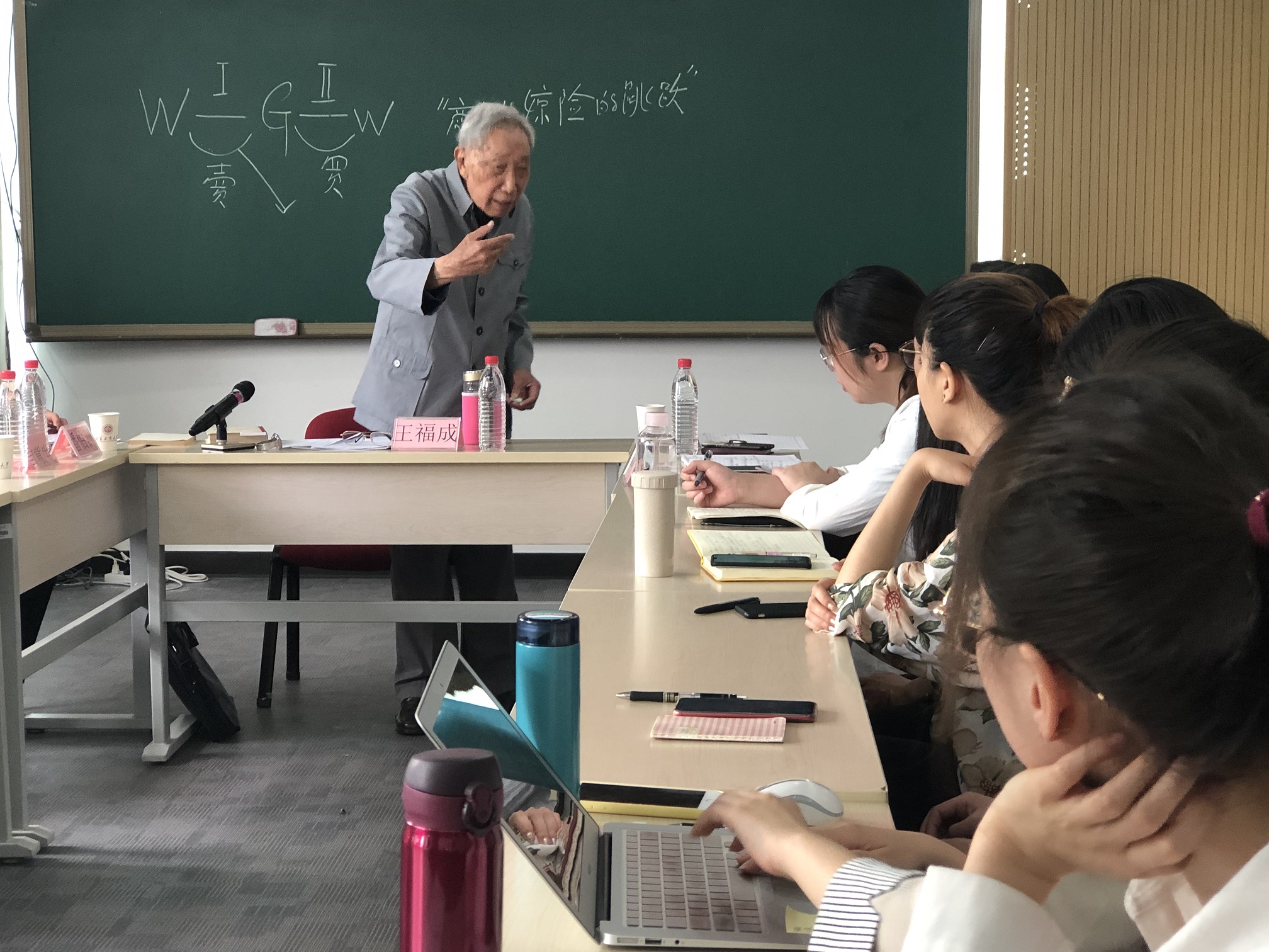 王福成教授以“我一輩子為黨做的一件事”為題,講述了他將畢生精力奉獻(xiàn)于馬克思《資本論》的學(xué)習(xí)、研究、傳播和運(yùn)用,并在這一過程中總結(jié)出了“做人”“治學(xué)”的道理,與各位老師和學(xué)生分享。他從自己在復(fù)旦大學(xué)認(rèn)真求學(xué)、參加地下黨投身革命事業(yè)談起,講述了自己是如何接觸到馬克思主義經(jīng)濟(jì)學(xué),并對其產(chǎn)生興趣,不斷研究。在傳播《資本論》章節(jié)中,王教授與大家分享了自己在其傳播過程中總結(jié)出的幾點(diǎn)感悟:堅(jiān)持在教學(xué)中立德樹人、堅(jiān)持在教學(xué)中因材施教、堅(jiān)持在教學(xué)中勇?lián)厝巍?jiān)持在教學(xué)中調(diào)查研究,引導(dǎo)同學(xué)在學(xué)習(xí)《資本論》時(shí)正確解決怎么“做人”和怎樣“治學(xué)”的問題,在“做人”方面要堅(jiān)定共產(chǎn)主義必勝、資本主義必亡的理想信念,在“治學(xué)”方面強(qiáng)調(diào)要下苦功夫,坐冷板凳。面對重任務(wù)、難人物、緊任務(wù),要勇于承擔(dān),不要輕易說不,把壓力轉(zhuǎn)化成動(dòng)力,盡一切完成好。在“研究、運(yùn)用《資本論》方面,王教授結(jié)合自身的經(jīng)歷,鼓勵(lì)學(xué)生黨員不斷樹立共產(chǎn)主義理想信念,要在學(xué)習(xí)黨的基本理論以及在學(xué)習(xí)中不斷實(shí)踐不斷堅(jiān)定信仰。