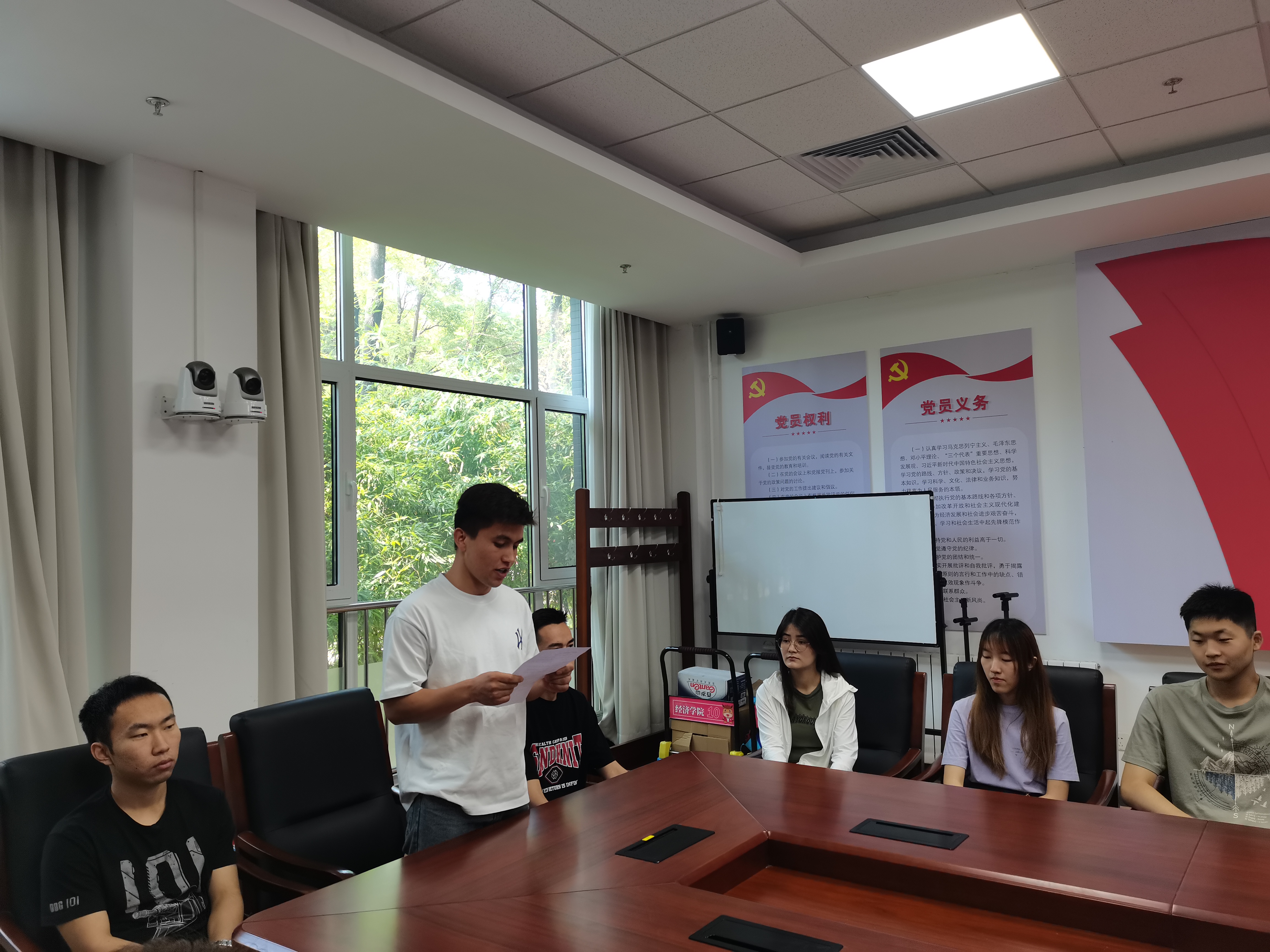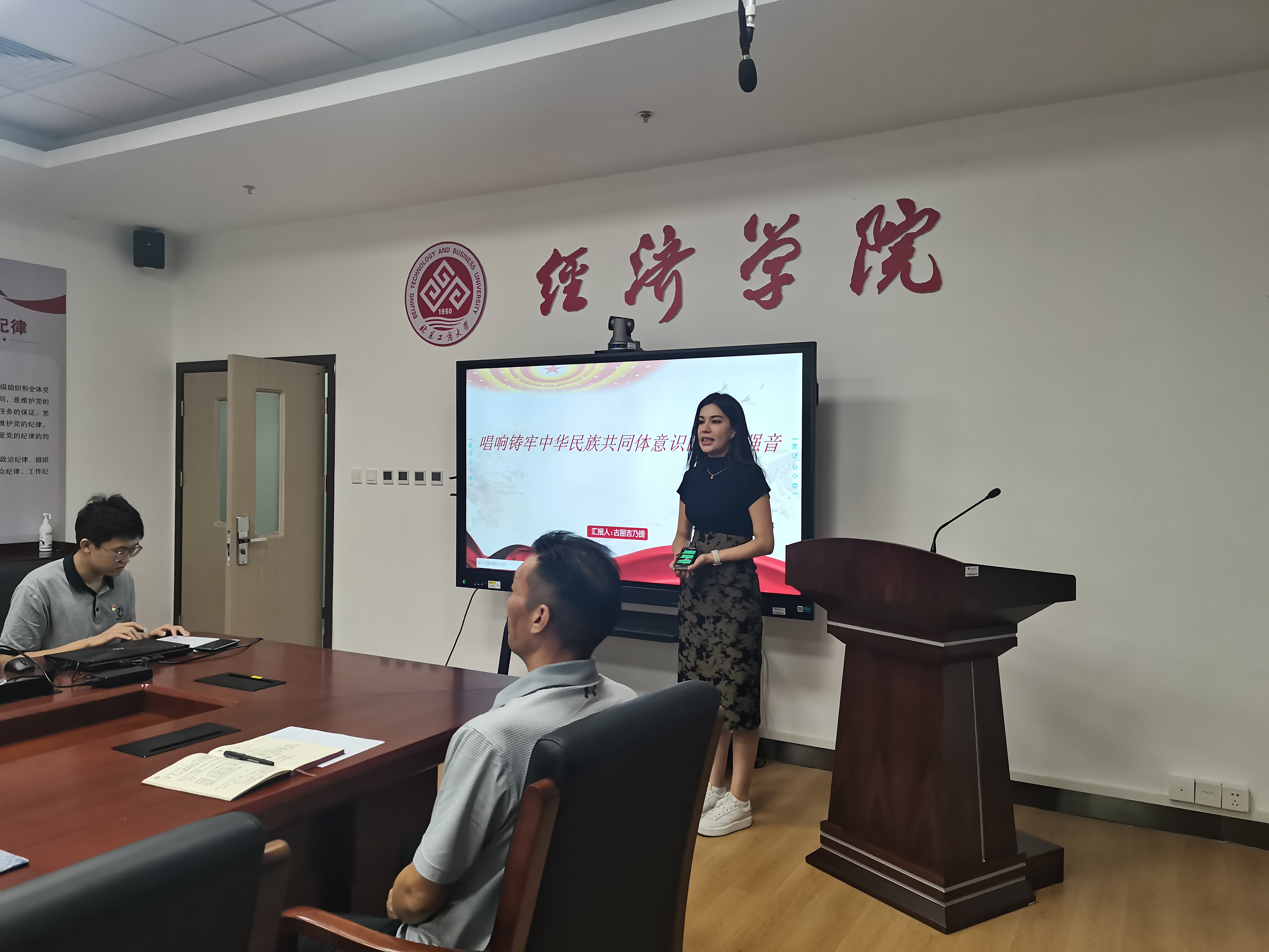 來自金融222班的少數民族入黨積極分子代表安外爾發言。他認為,作為少數民族的同學,要時刻牢記黨的恩情,積極投身到黨組織的建設中去,珍惜黨組織給予的機會,努力學習取得有益成績,用實際行動向黨組織和國家表達感激之情,共同建設團結美好和諧的北工商校園。