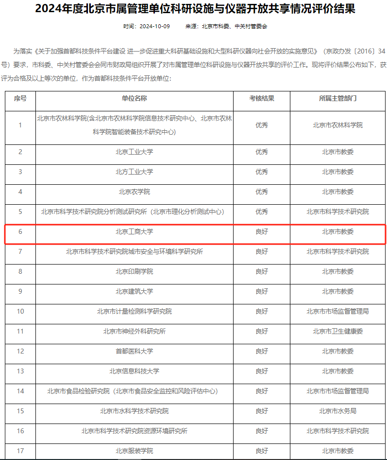 為落實《關(guān)于加強(qiáng)首都科技條件平臺建設(shè) 進(jìn)一步促進(jìn)重大科研基礎(chǔ)設(shè)施和大型科研儀器向社會開放的實施意見》(京政辦發(fā)〔2016〕34號)要求,北京市科委、中關(guān)村管委會會同北京市財政局組織開展了對市屬管理單位科研設(shè)施與儀器開放共享的評價工作,獲評為合格及以上等次的單位,才能作為首都科技條件平臺開放單位。本次共有52家市屬管理單位參評,我校第一次參評,并獲得良好等級第一名,總名次第六的佳績。