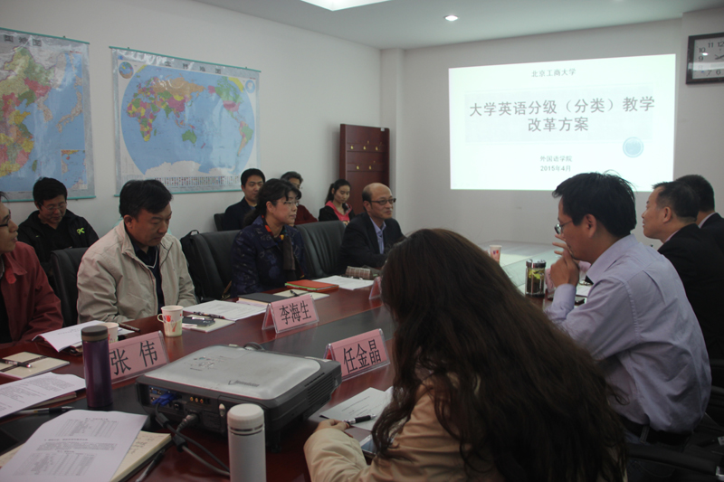 4月15日,外國語學(xué)院邀請(qǐng)校內(nèi)外專家在阜成路校區(qū)召開了大學(xué)英語分級(jí)教學(xué)改革方案研討會(huì)。來自北京市高教學(xué)會(huì)大學(xué)英語研究會(huì)的專家同我校相關(guān)部門領(lǐng)導(dǎo)、專家匯聚一堂就大學(xué)英語分級(jí)教學(xué)改革進(jìn)行研討。外國語學(xué)院院長羅朝能主持會(huì)議。