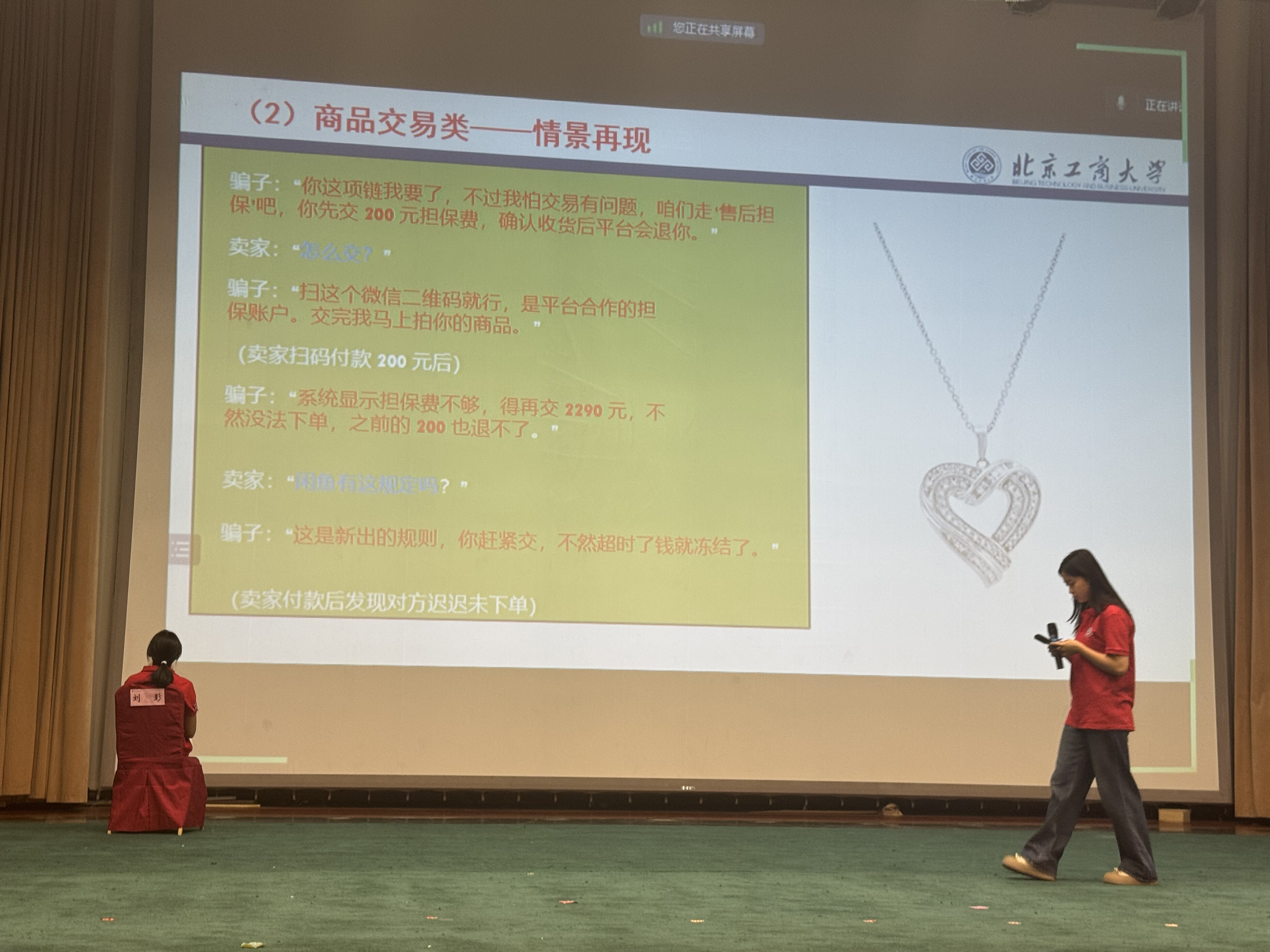 在本、研新生反詐安全教育講座過程中,6名宣講組成員分工合作,分別從電信網絡詐騙概述、高校常見電信網絡詐騙類型、我校防范電信詐騙工作開展情況、防范電信網絡詐騙應對策略四個方面進行宣講。在講解高校常見電信網絡詐騙類型環節,每個案例均通過視頻和現場模擬表演短劇的形式來呈現,讓聽課學生在形象生動地短劇中“沉浸式”了解詐騙的詳細過程,為日后可能遇到的詐騙場景留下深刻印象,減少上當受騙的幾率。宣傳大使還特別有針對性地介紹了我校近三年真實發生的電詐大數據,從電詐高發類別、高發時段、高發學院、高發群體、關鍵特征等方面進行分析,讓新生既能直觀感受到電詐風險就在身邊,又清楚知道該從哪些方面進行重點防范。這種針對性強、寓教于樂的“朋輩教育”電詐教育宣傳形式,較比傳統的宣教模式在教育效果上有了很大的提升,是在高校反詐教育路徑上的積極創新探索,得到了上級公安部門的高度肯定。