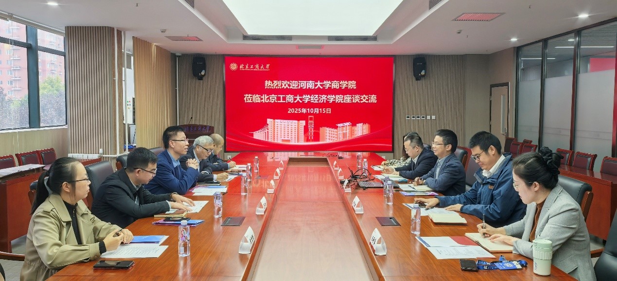 詹新宇對席龍勝院長一行的到訪表示熱烈歡迎。與會人員共同觀看了北京工商大學宣傳片。詹新宇全面介紹了經濟學院的學科建設概況,重點圍繞師資隊伍與團隊建設、科研實力與成果產出、人才培養與就業工作等方面,分享了學院近年來的發展成就與工作經驗。許敬軒和岳鵬鵬分別從學院和學校角度,介紹了科研課題申報的組織與管理經驗。