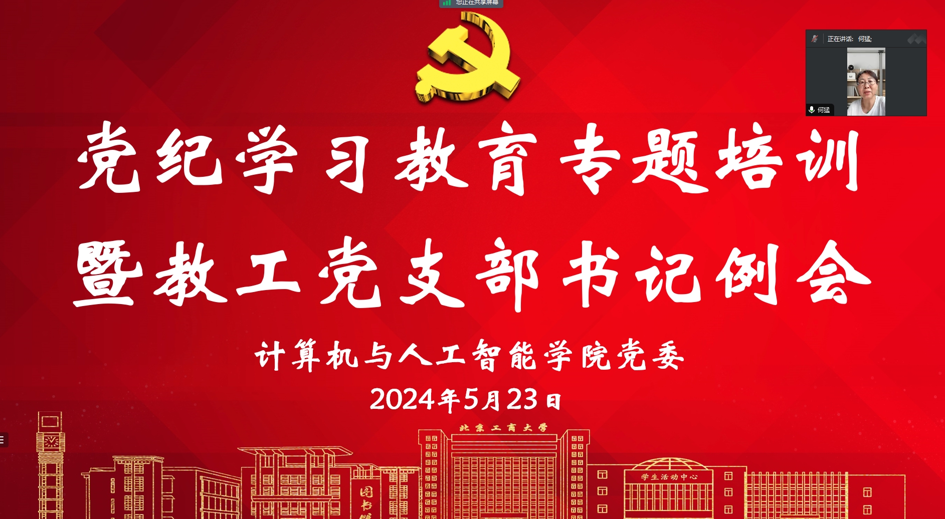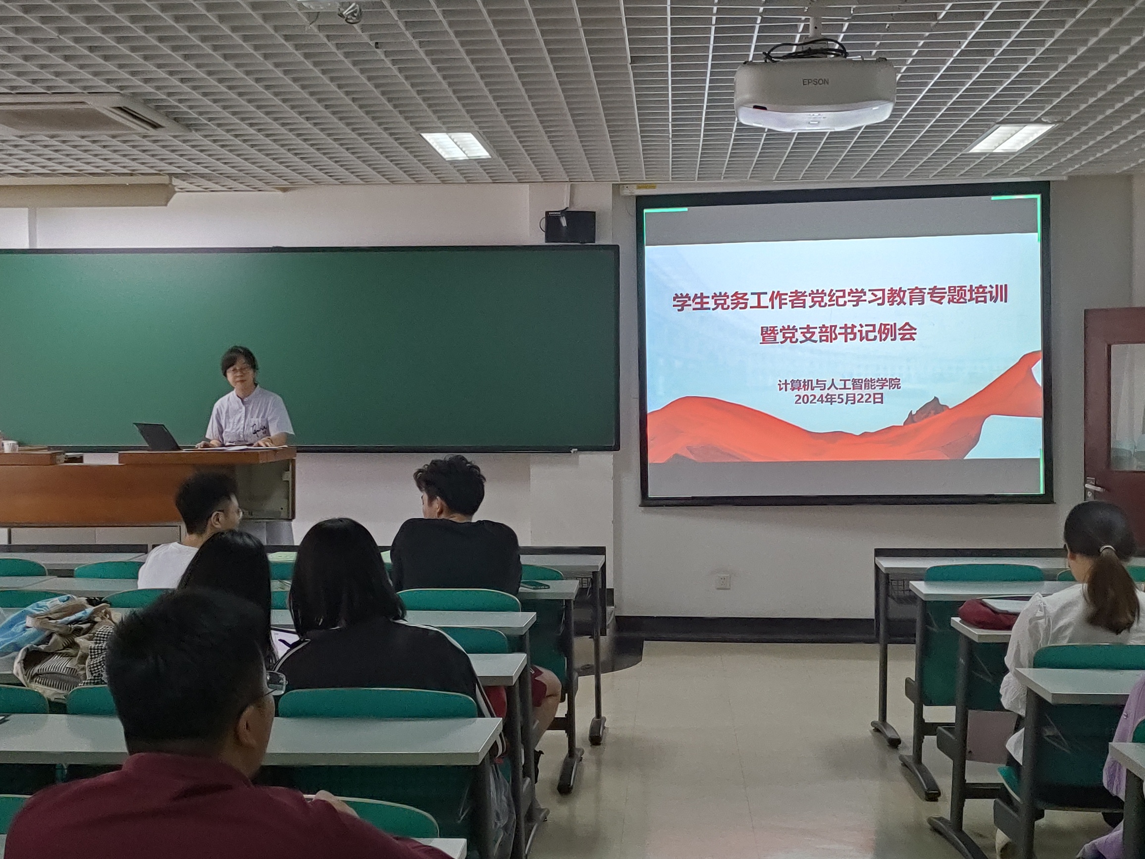 5月22日、23日,計算機與人工智能學院黨委開展了師生黨務工作者黨紀學習教育專題培訓暨黨支部書記例會。會議通過線下線上結合的方式在兩校區分別進行,全體師生黨支部書記及支部委員參加了培訓。培訓由學院黨委書記何猛、專職組織員張艷婷分別主持。