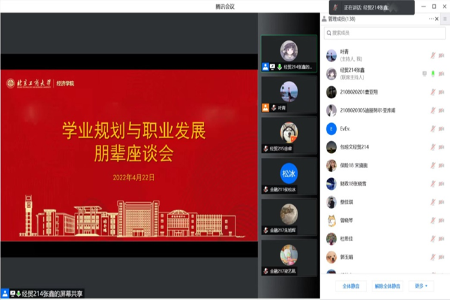 4月22日,學(xué)院針對(duì)21級(jí)新生線上開(kāi)展了學(xué)業(yè)規(guī)劃與職業(yè)發(fā)展朋輩座談會(huì),邀請(qǐng)了1名優(yōu)秀畢業(yè)生和6名高年級(jí)優(yōu)秀學(xué)生參與座談,21級(jí)全體學(xué)生參加?,F(xiàn)就職于中融信托、金融10級(jí)畢業(yè)生江小蕾、已保送到北京師范大學(xué)經(jīng)濟(jì)182班學(xué)生閆思彤、保送到中國(guó)社會(huì)科學(xué)院大學(xué)經(jīng)濟(jì)182班學(xué)生劉永琦、考入北京工商大學(xué)貿(mào)經(jīng)181班學(xué)生杜思佳、考入湖南大學(xué)保險(xiǎn)18班學(xué)生宋旖旎、考入南京大學(xué)財(cái)政18班學(xué)生張曉雪以及退伍學(xué)生金融203班彭東分別分享了自己的在校經(jīng)歷以及保研、考研、入伍的相關(guān)經(jīng)驗(yàn)。本次經(jīng)驗(yàn)分享會(huì)為2021級(jí)新生與優(yōu)秀畢業(yè)生及高年級(jí)在校生提供了學(xué)習(xí)交流的平臺(tái),對(duì)于引導(dǎo)新生樹(shù)立遠(yuǎn)大理想、明確學(xué)習(xí)目標(biāo)、提高學(xué)習(xí)能力具有重要的意義,同學(xué)們紛紛表示受益匪淺。