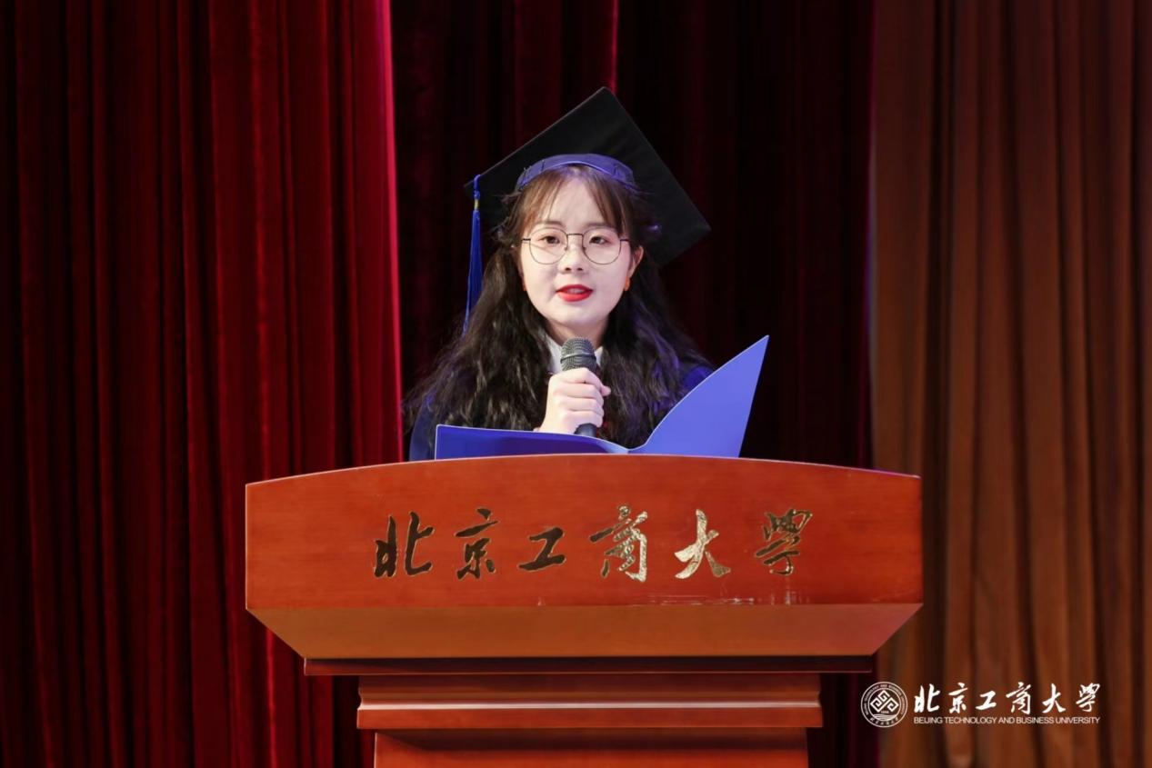 商學院畢業生代表、商研2032班仇紫晨發言,她代表2023屆全體畢業生向母校和老師表達了深深的感激之情,畢業生們定會在踔厲前行中創造出燦爛的未來,祝福母校,也祝福畢業生們。