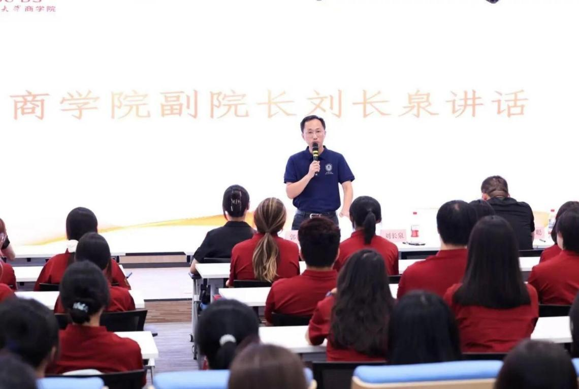 劉長泉結合自身求學與工作經歷對新生步入大學,提出三點建議。一是清晰認知自我,強化對學院與專業的歸屬感;二是傳承學院紅色基因,樹立集體榮譽感;三是作為一流商科學生,堅定責任擔當。他鼓勵新生在校園生活中加強自我管理,潛心學習、不懼困難,成長為有夢想、有價值、有信仰的人。