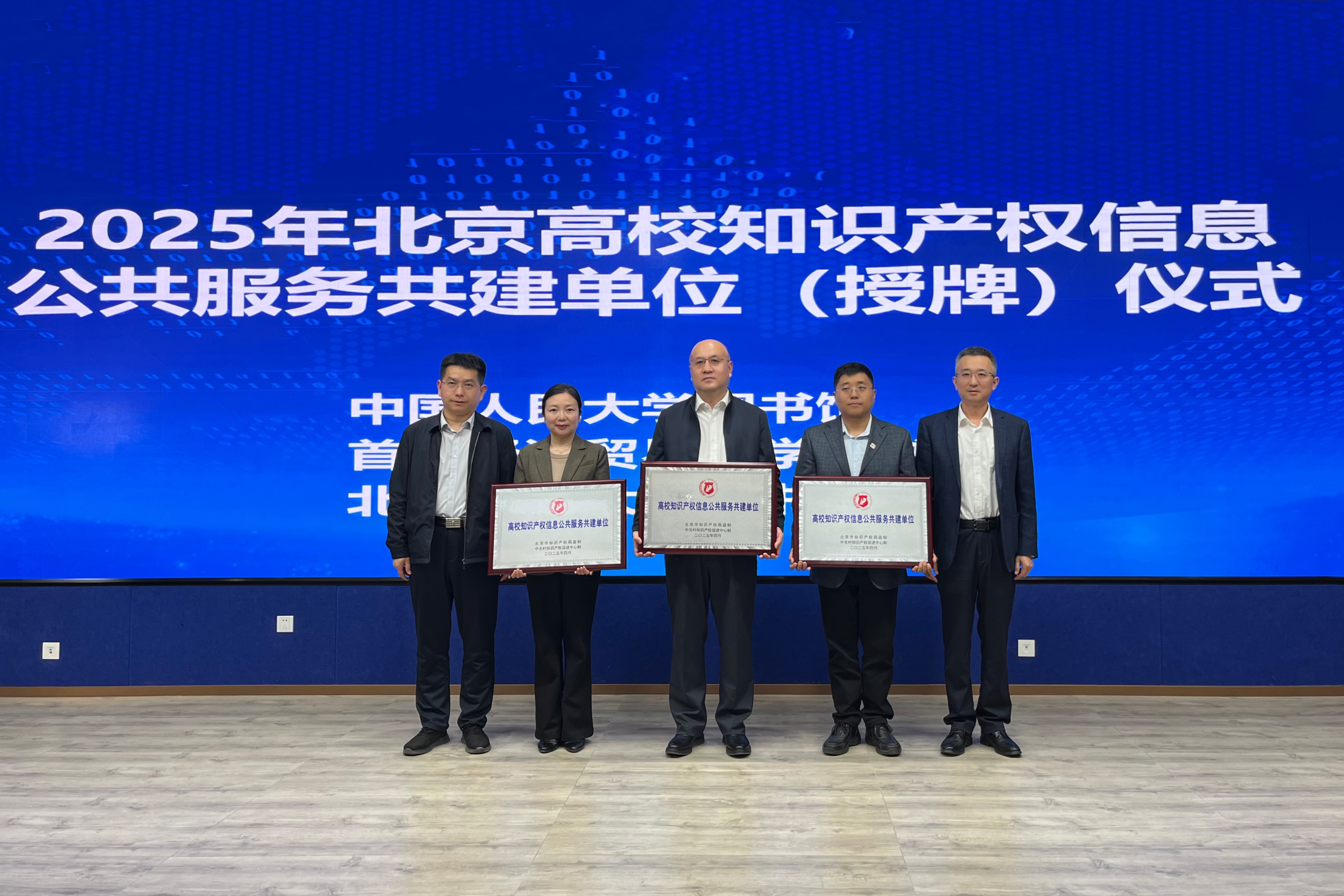 會(huì)議舉行了2025年北京高校知識(shí)產(chǎn)權(quán)信息公共服務(wù)共建設(shè)單位(授牌)儀式,館長(zhǎng)馬春暉代表學(xué)校圖書館接受北京市知識(shí)產(chǎn)權(quán)局和中關(guān)村知識(shí)產(chǎn)權(quán)促進(jìn)中心的授牌。